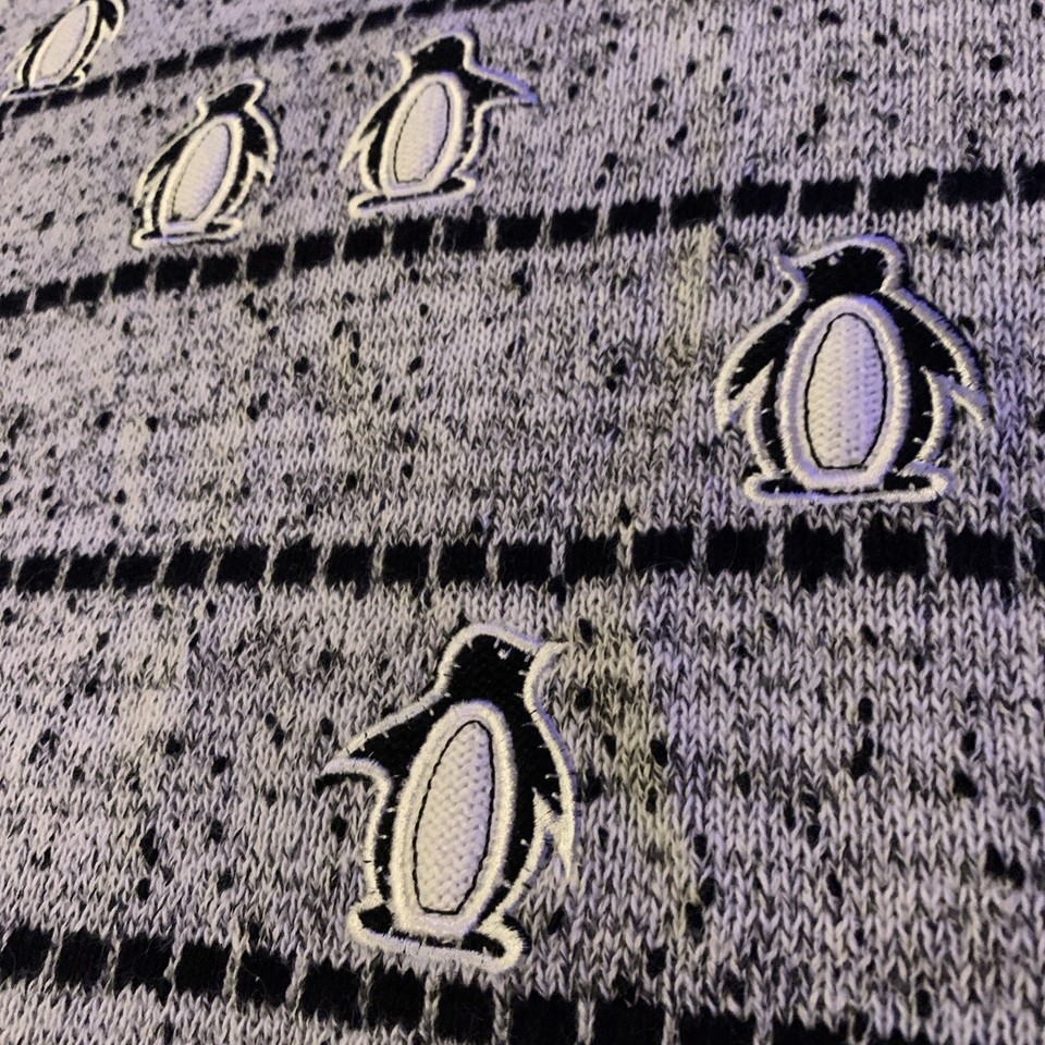 This vintage Christopher Banks women's sweater features a festive gray color with a black penguin pattern, perfect for the winter season. Made from a blend of polyester, ramie, and cotton, this knit sweater has long sleeves and a round neckline. The stitching accents add a charming touch, making it a stylish choice for casual or travel occasions. Perfect for those who adore animals, Christmas, and holiday themes, this sweater is a cozy and playful addition to any wardrobe.