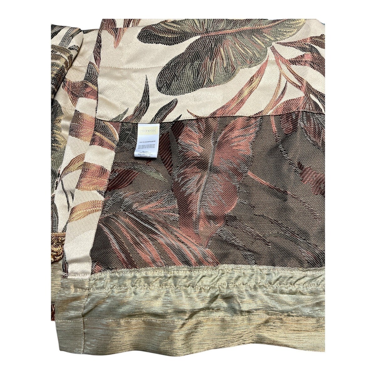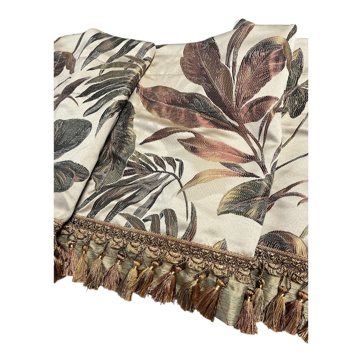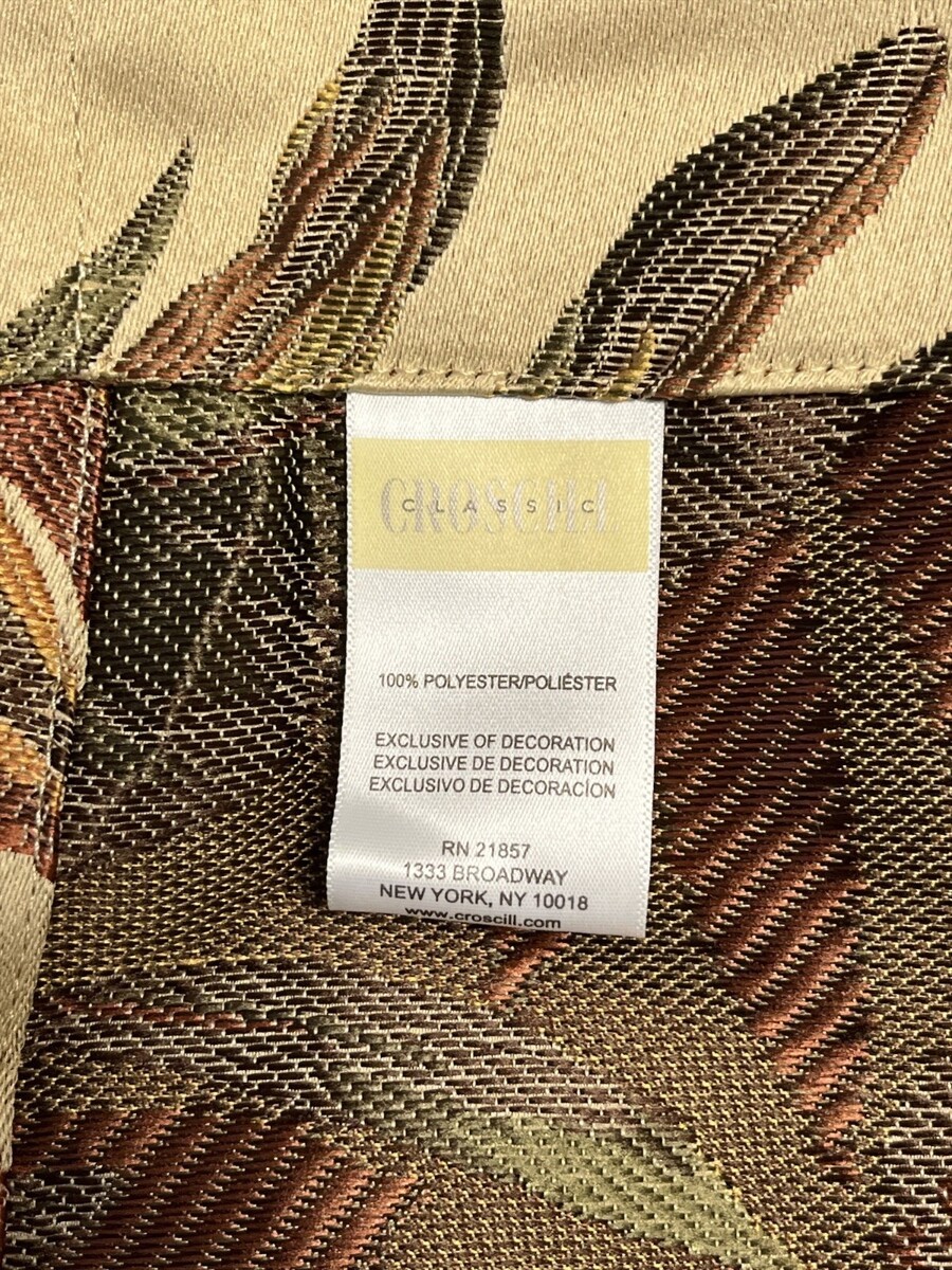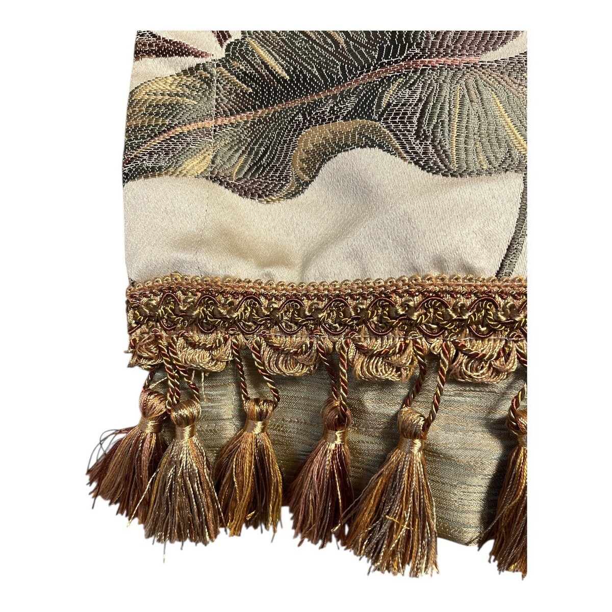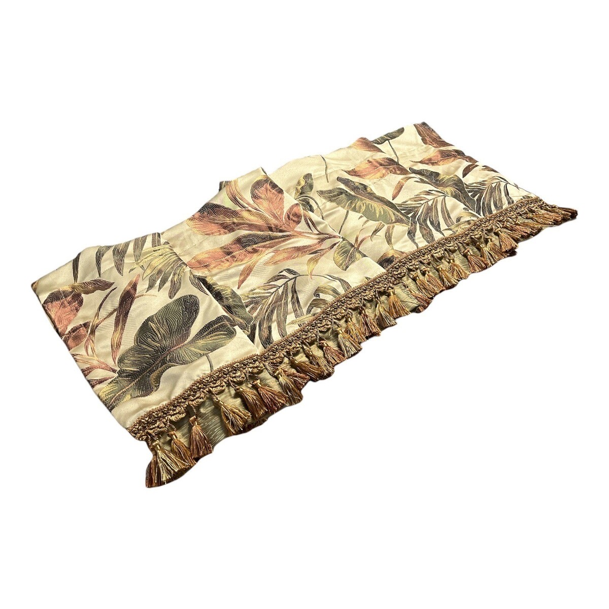 Elegant Croscill window valance featuring a tropical leaf jacquard pattern in warm tones of gold, green, and copper. Finished with a decorative tassel fringe and a rod pocket for easy hanging. High-quality woven fabric with rich texture and classic Croscill detailing.