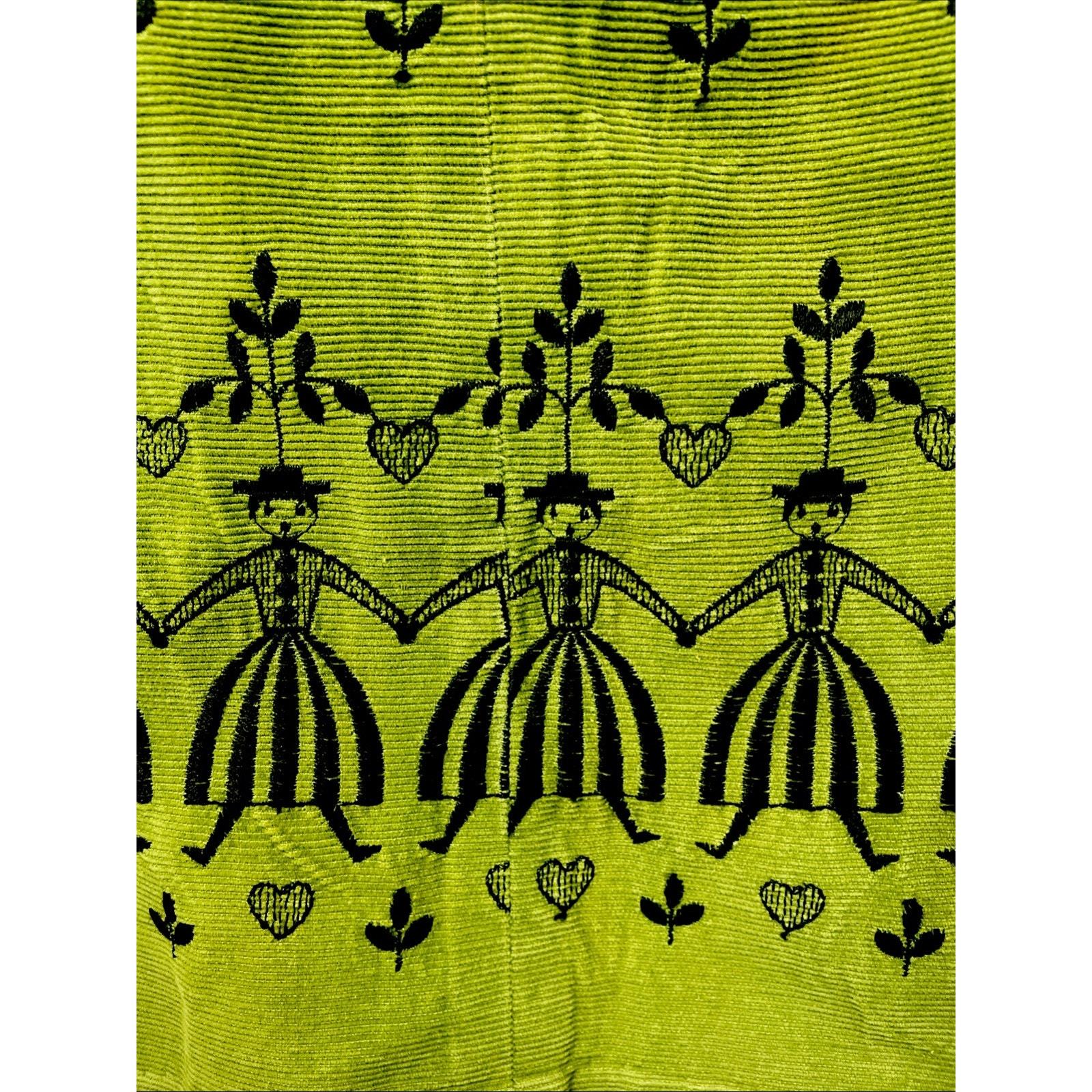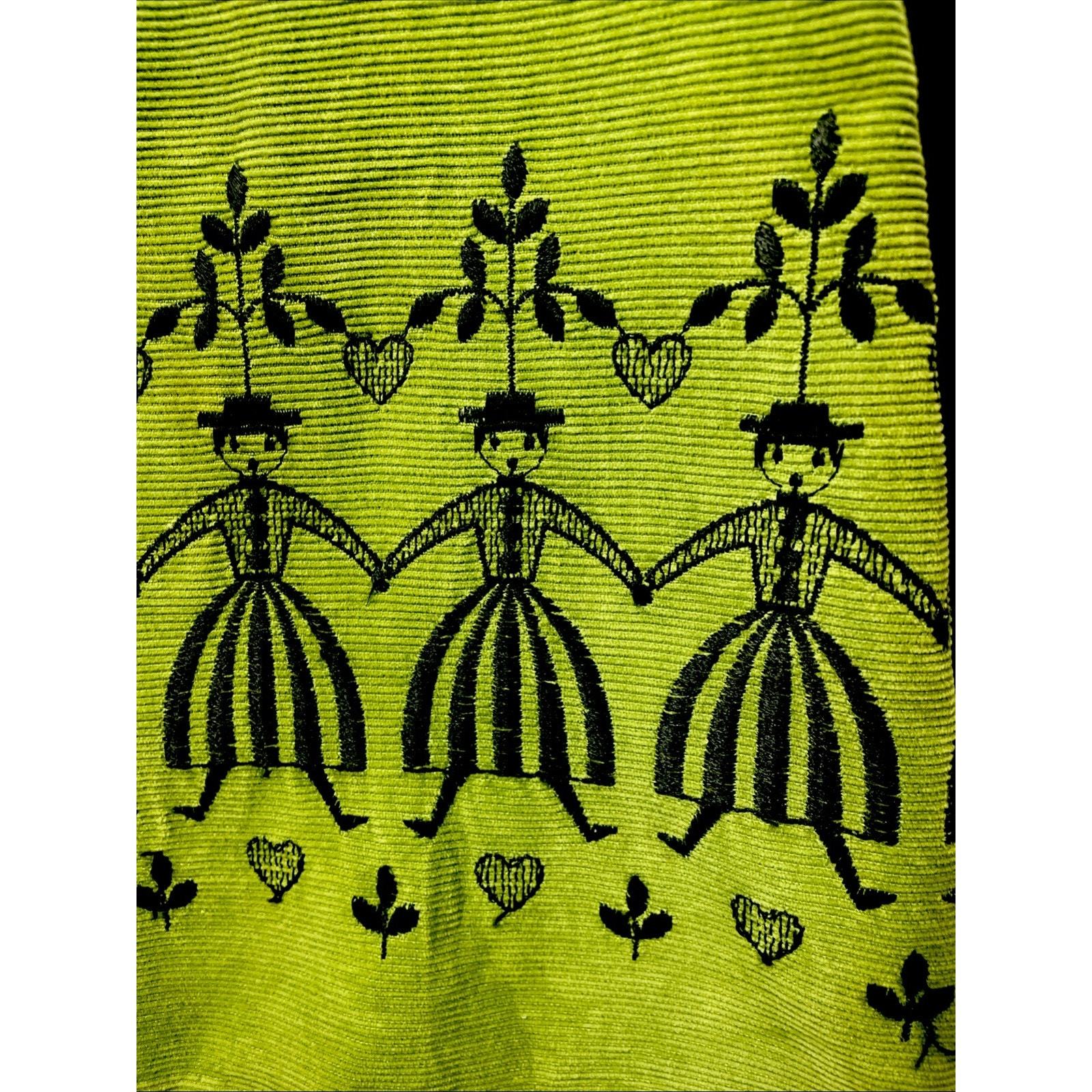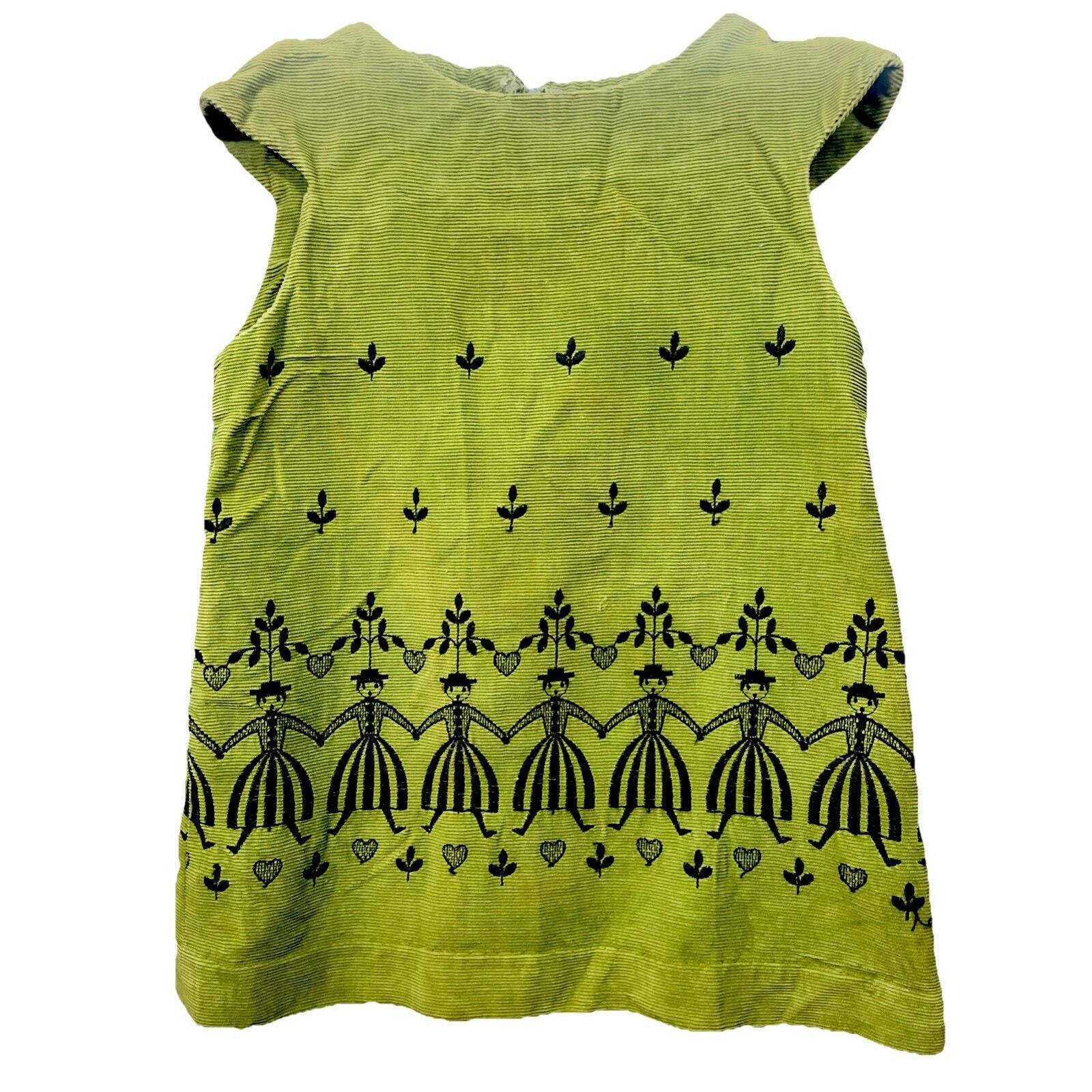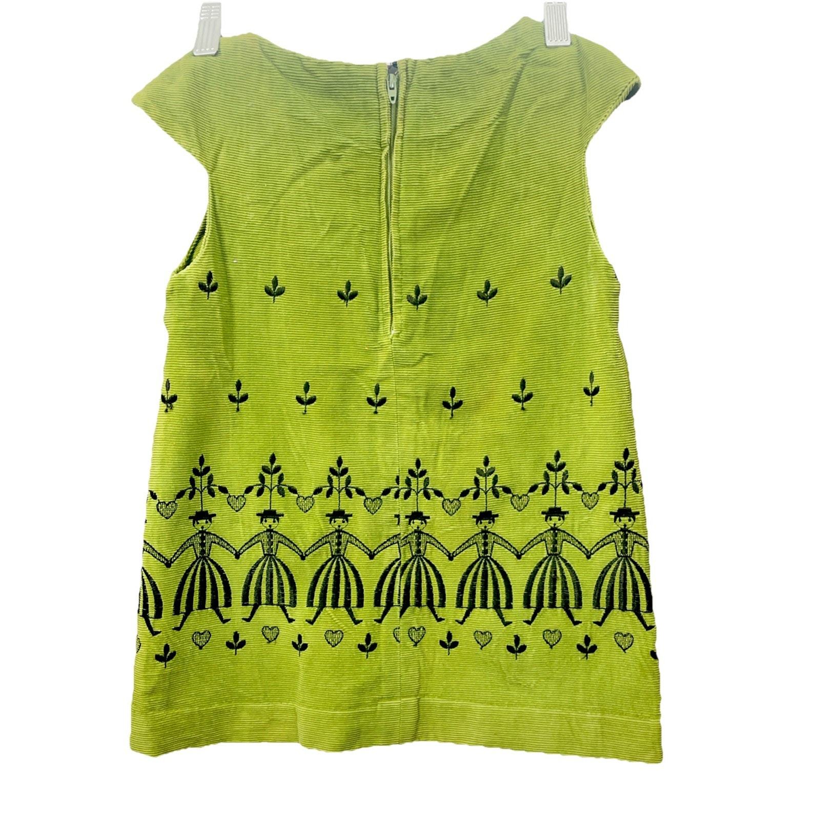 This vintage handmade toddler dress features soft green corduroy fabric, a sleeveless cut, and a charming folk art-style sewn design along the hem and bodice. The dress showcases adorable figures and heart motifs in black thread, adding a unique, playful touch. Back zipper closure; likely fits a toddler size (approximate measurements available upon request).