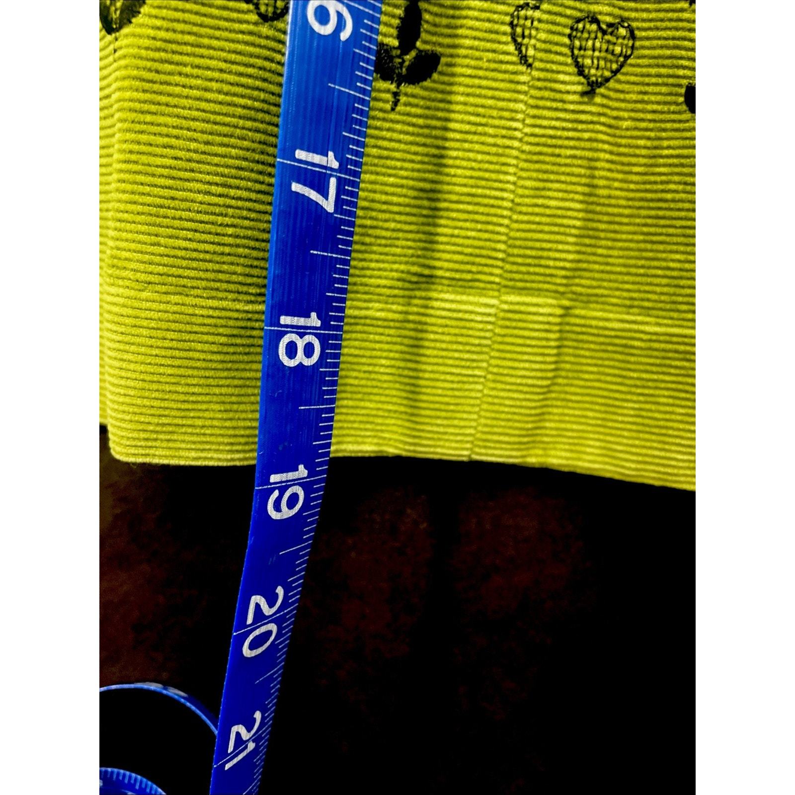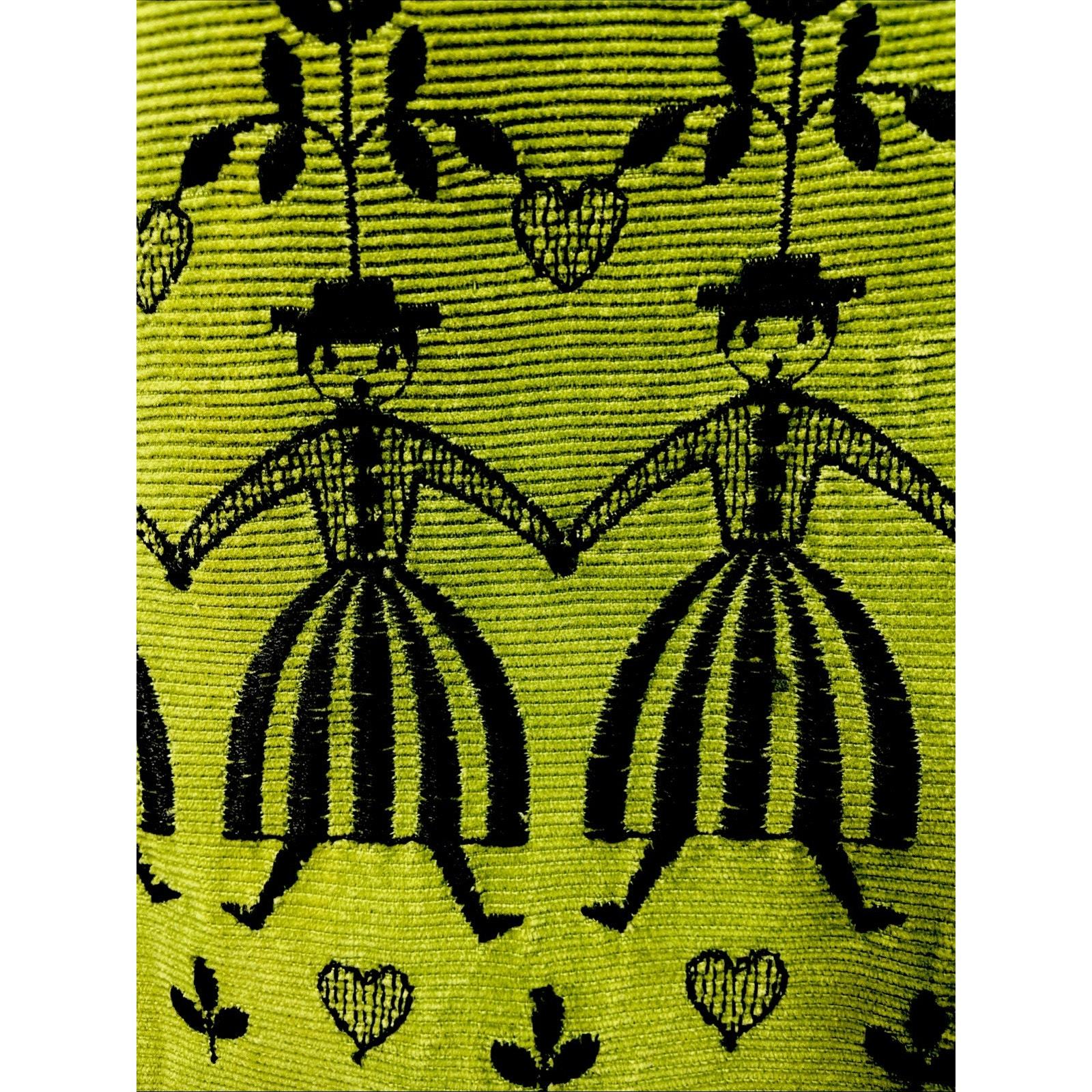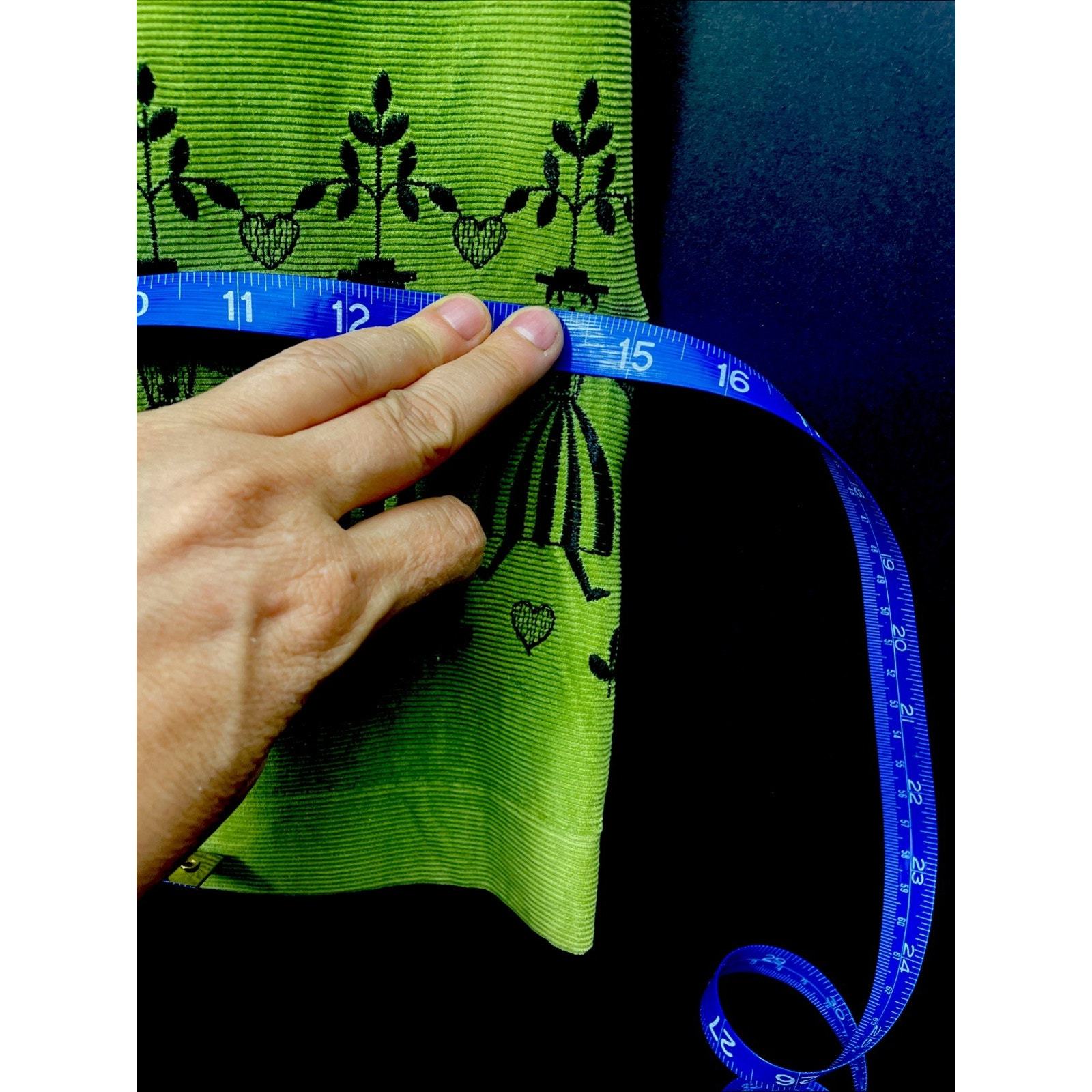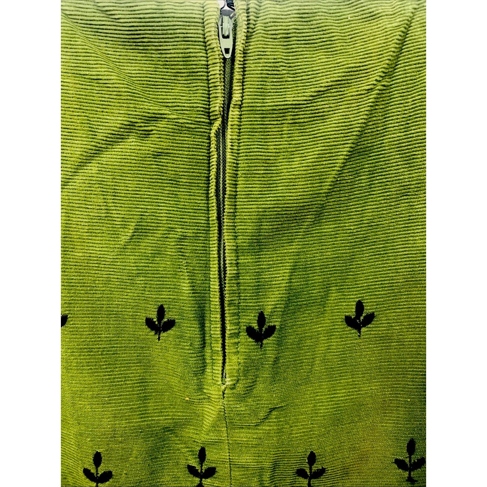 This vintage handmade toddler dress features soft green corduroy fabric, a sleeveless cut, and a charming folk art-style sewn design along the hem and bodice. The dress showcases adorable figures and heart motifs in black thread, adding a unique, playful touch. Back zipper closure; likely fits a toddler size (approximate measurements available upon request).