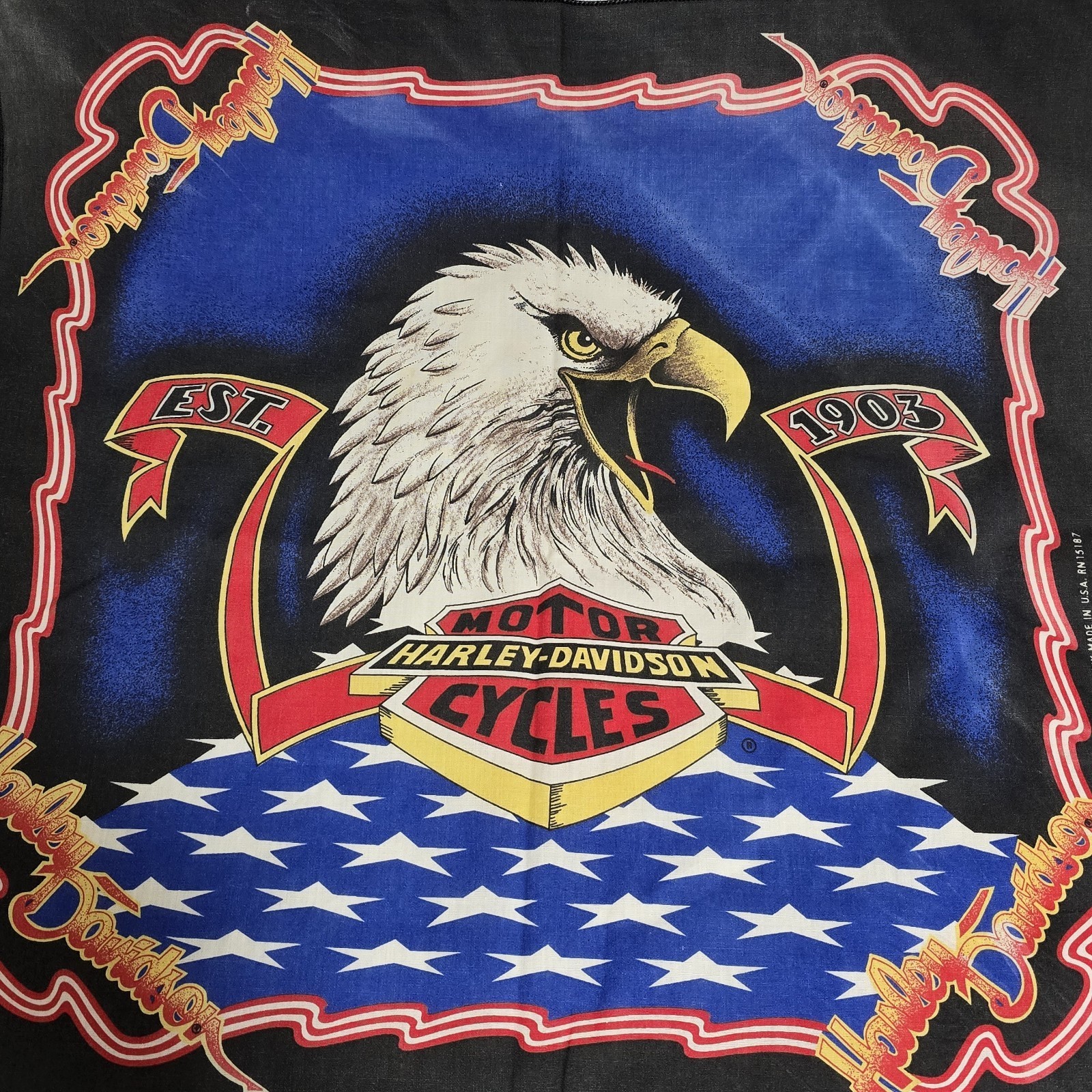 Vintage 1980s Harley Davidson Handkerchief Bandana Eagle Flag Stars Stripes - Made in USA.