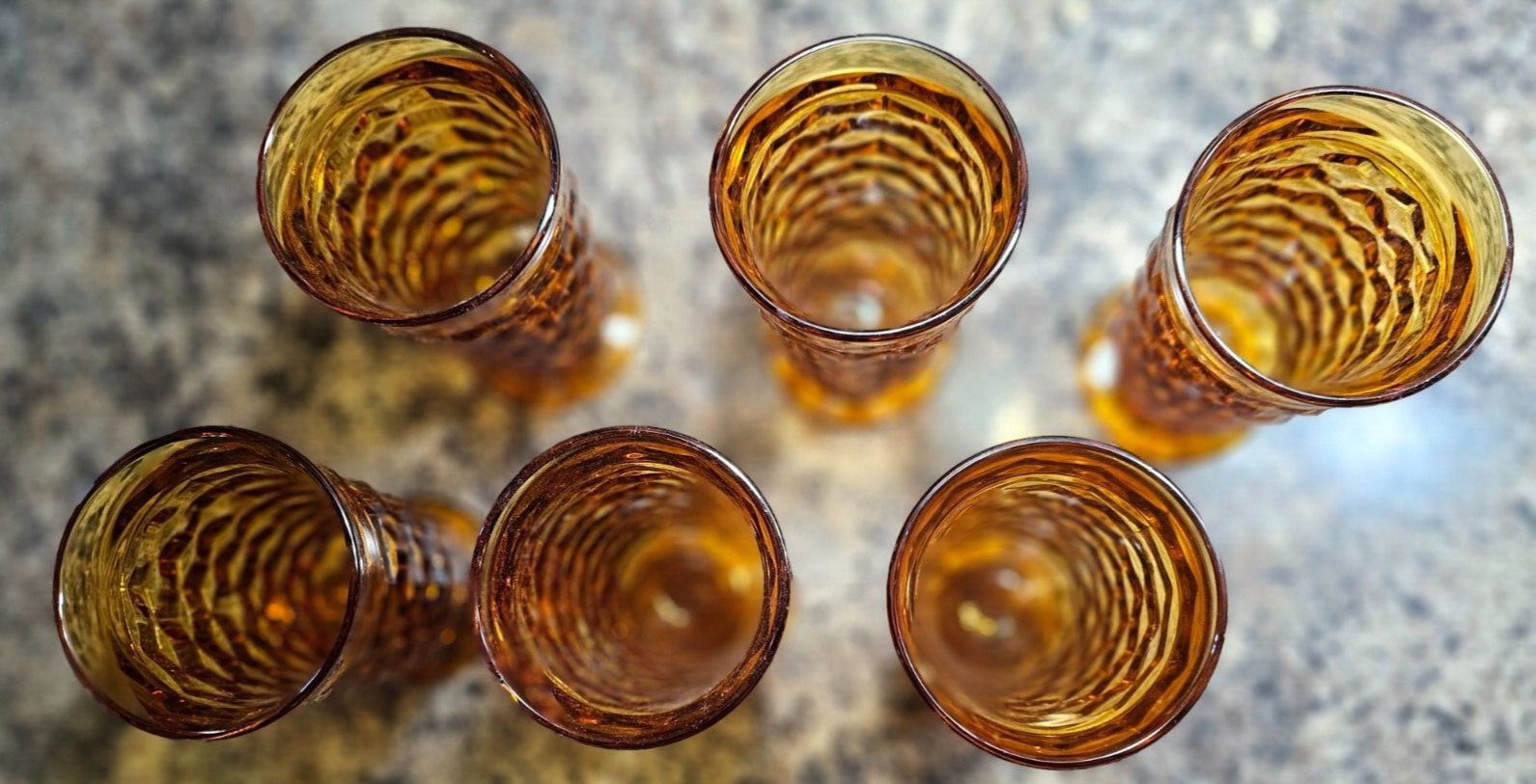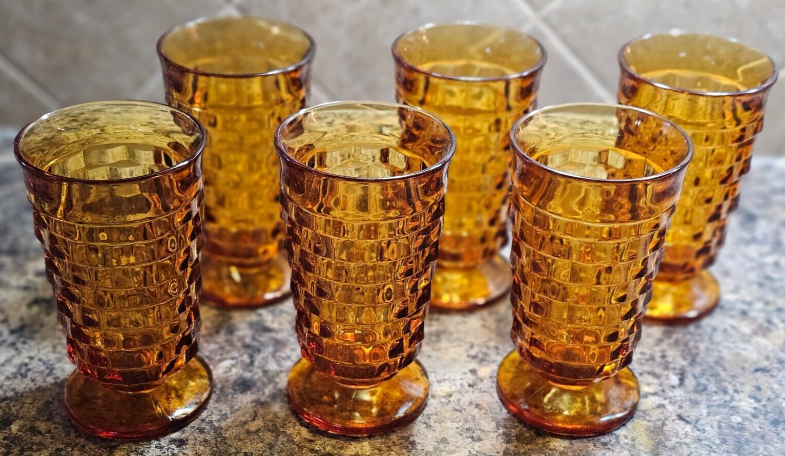- VTG Indiana Whitehall Colony Cubist Amber Glass Footed Iced Tea Tumbler Set of 6