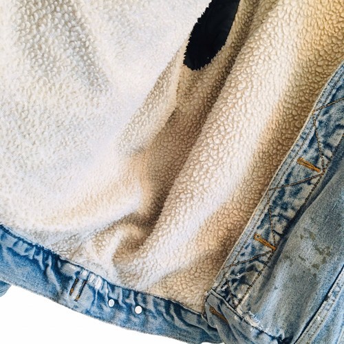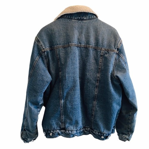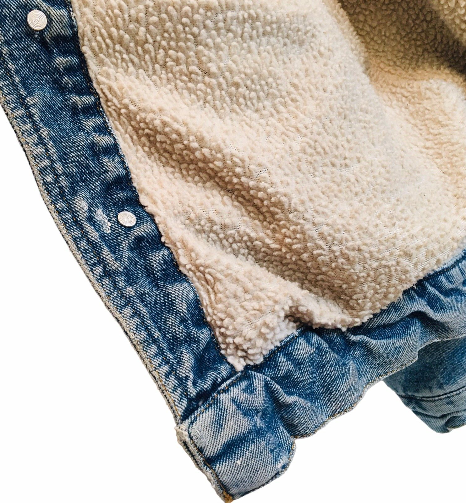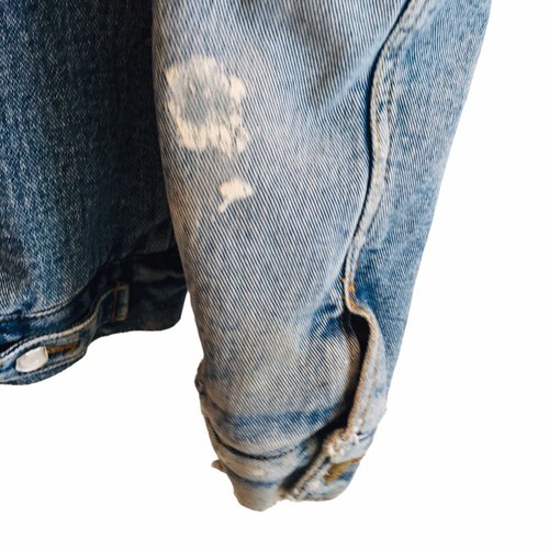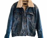 VTG Lee Fleece Lined Denim Trucker Jacket L Paint Marks Distressing Faux Sherpa