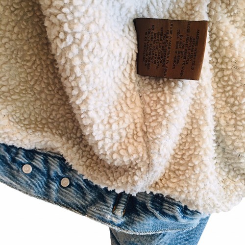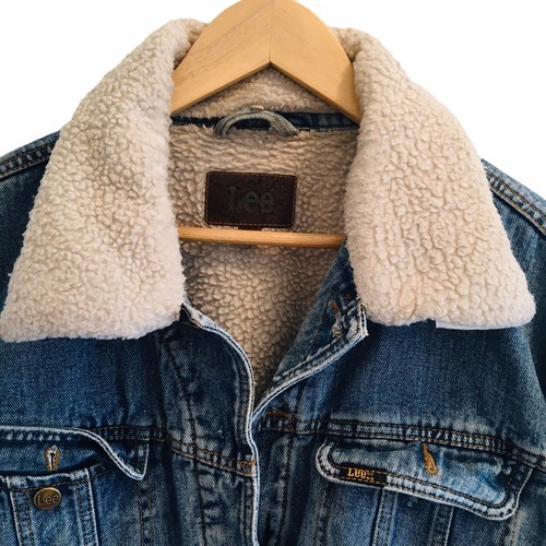 VTG Lee Fleece Lined Denim Trucker Jacket L Paint Marks Distressing Faux Sherpa.