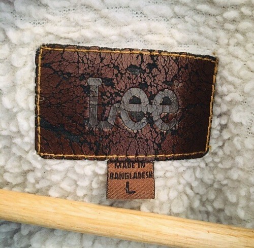 - VTG Lee Fleece Lined Denim Trucker Jacket L Paint Marks Distressing Faux Sherpa