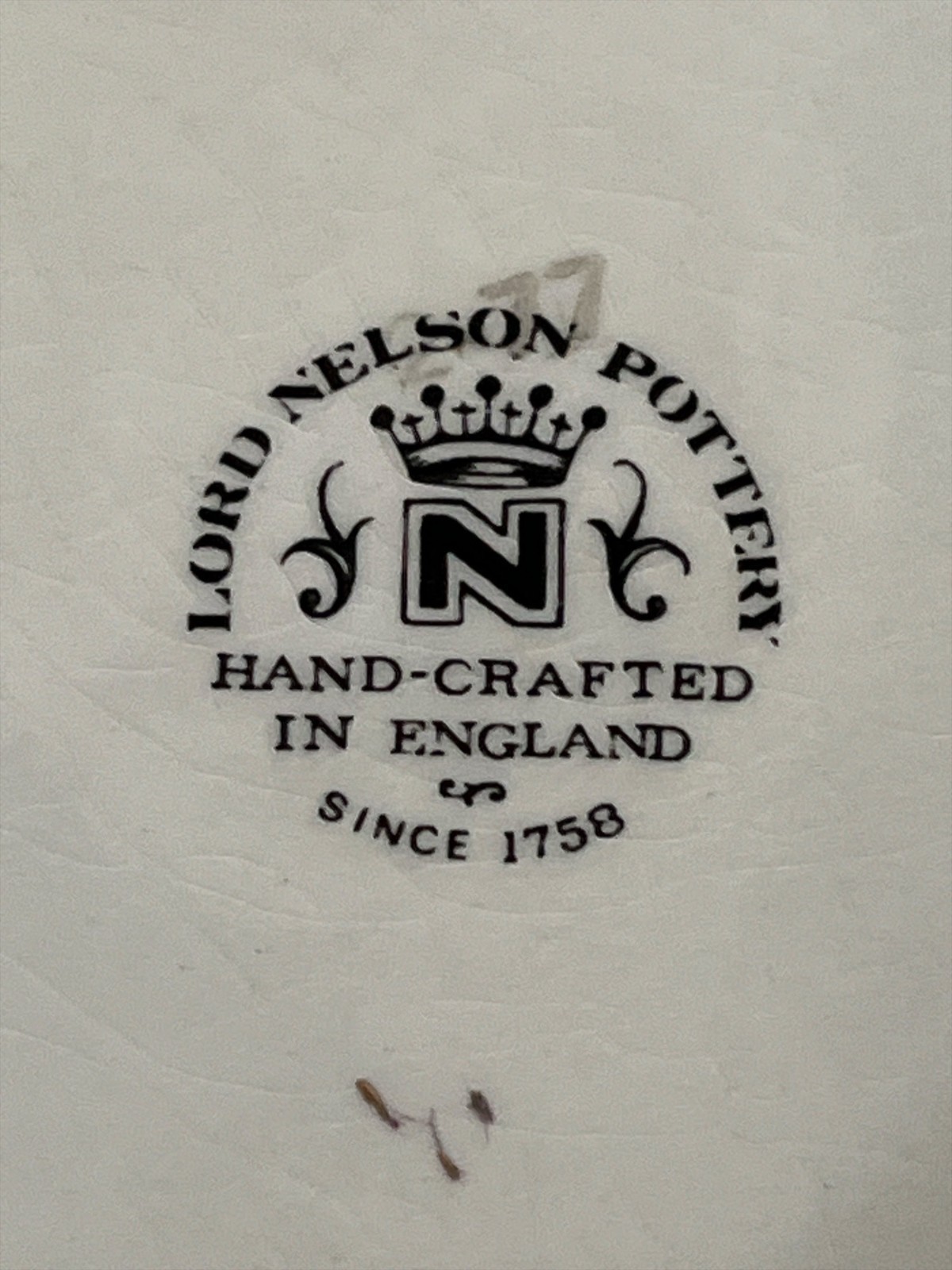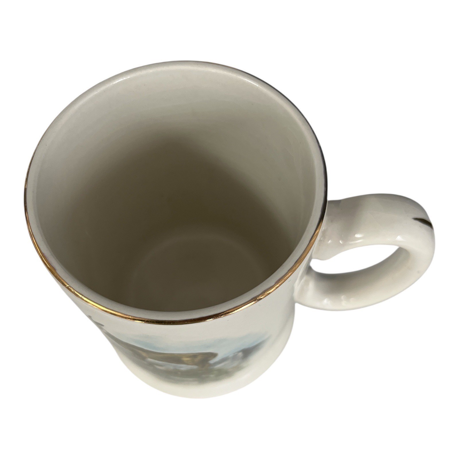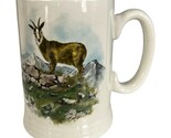 This vintage Lord Nelson Pottery mug features a hand-painted style design of a mountain goat standing among rocky peaks, accented with a fine gold rim. Made in England and marked with the classic Lord Nelson Pottery hallmark, this piece reflects the craftsmanship of a brand with roots dating back to 1758. A charming addition for collectors of English pottery, wildlife art, or rustic cabin decor.