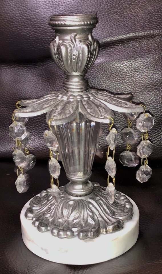 VTG Mid Century Brass Crystal Candle Holder Italian Marble Hollywood Regency