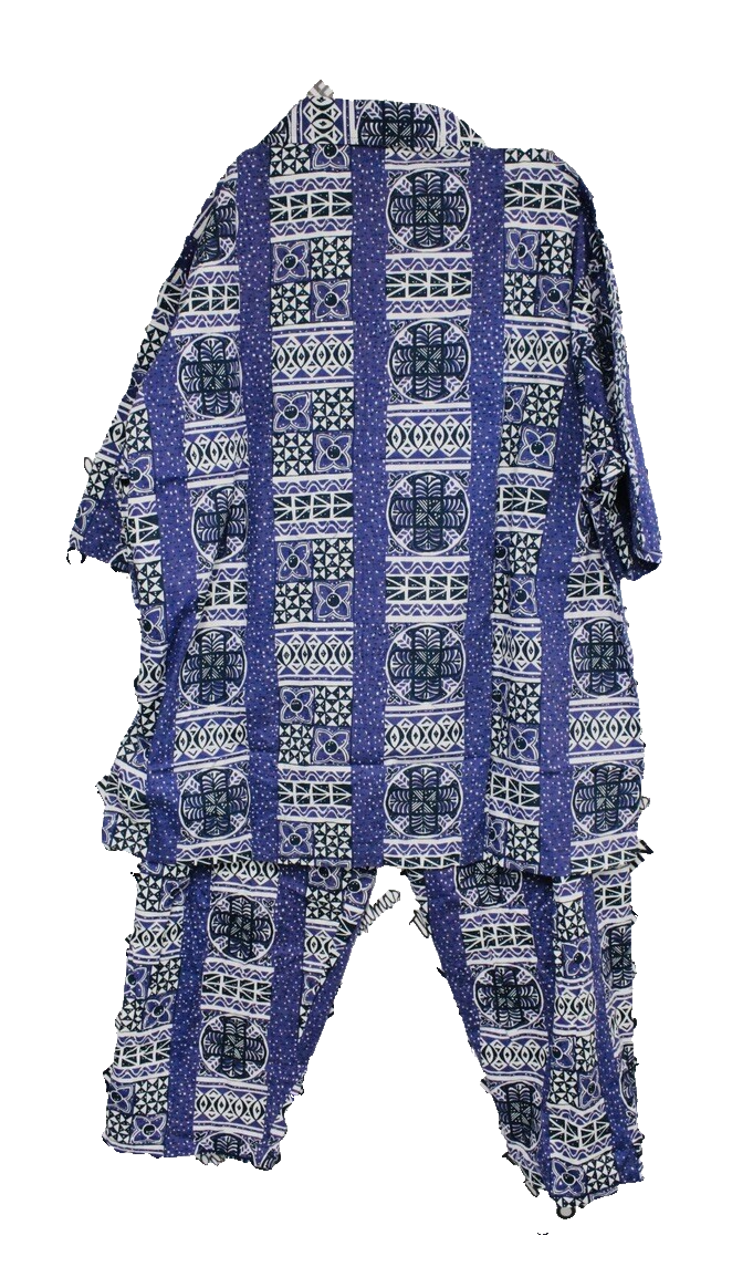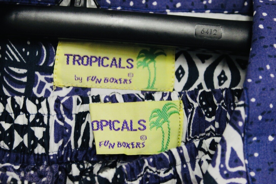 100% cotton (believed), purple and white tropical print, button-front shirt, elastic waist + button fly + drawstring pajama pants, Fun Boxers label, NOS with tags