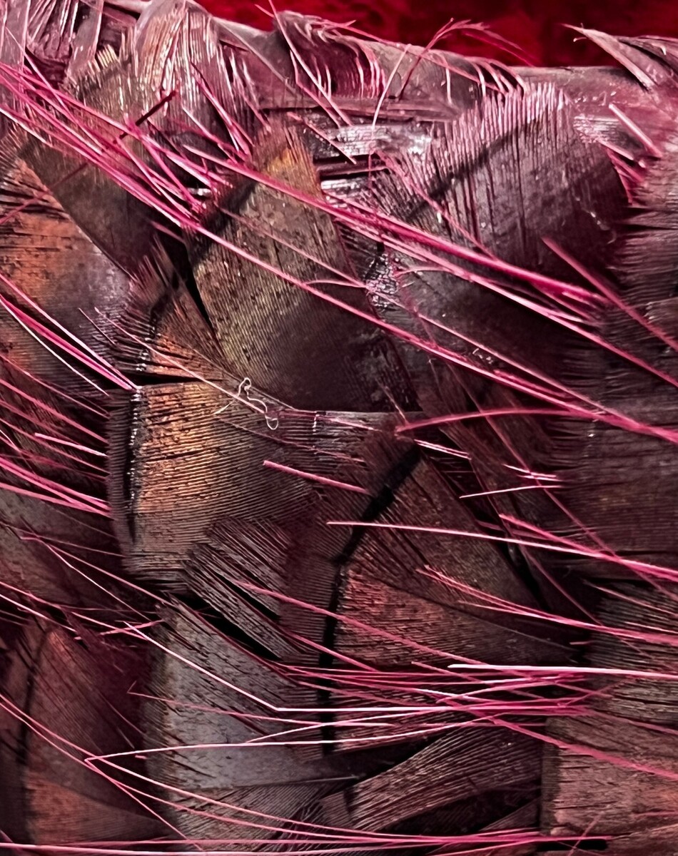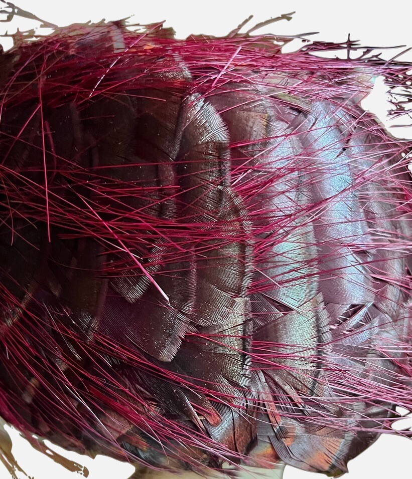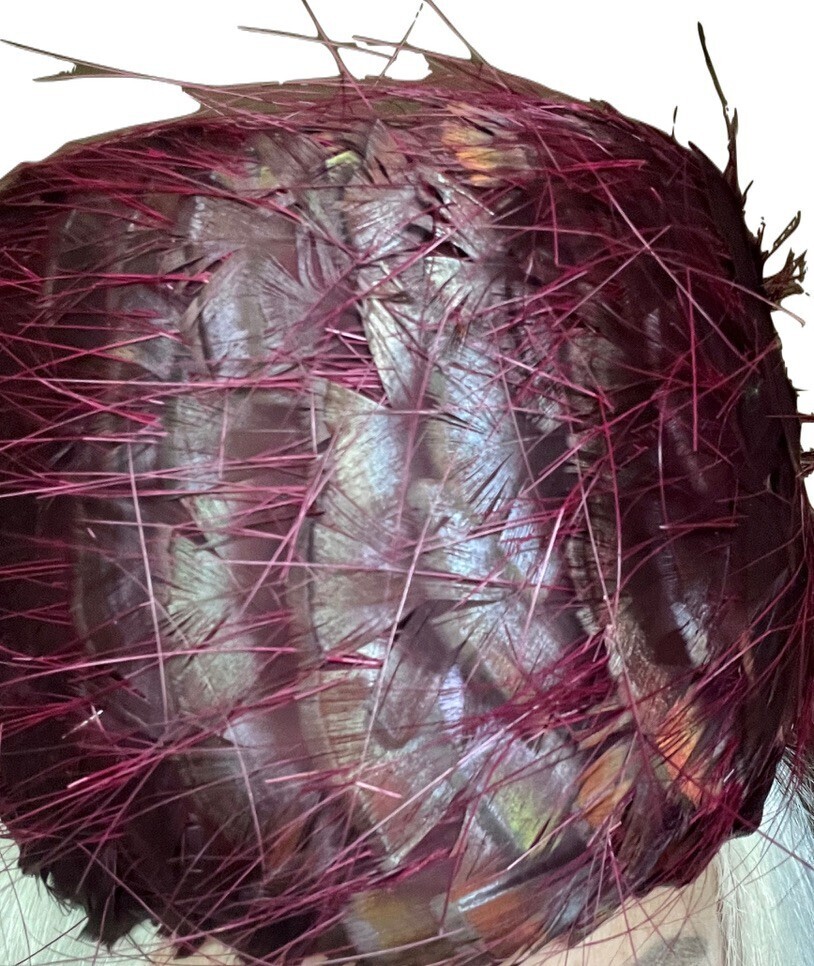 VTG Red Feather Toque Pillbox Hat 1950s Unique Small Head- it's gorgeous but the long ( do not know what kind) skinny feathers are loose...about 4 1/2" tall, maybe best for parts. The red feathers are somewhat iridescent with an orange tinge.