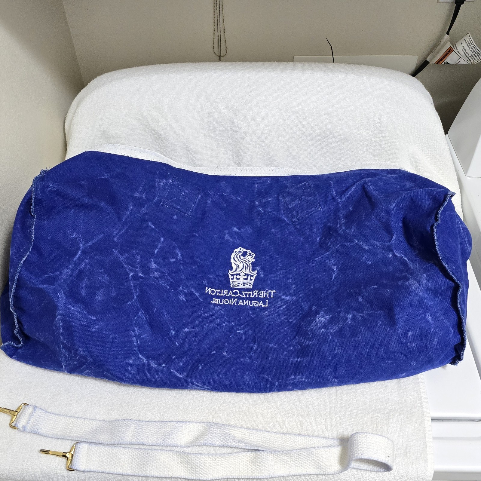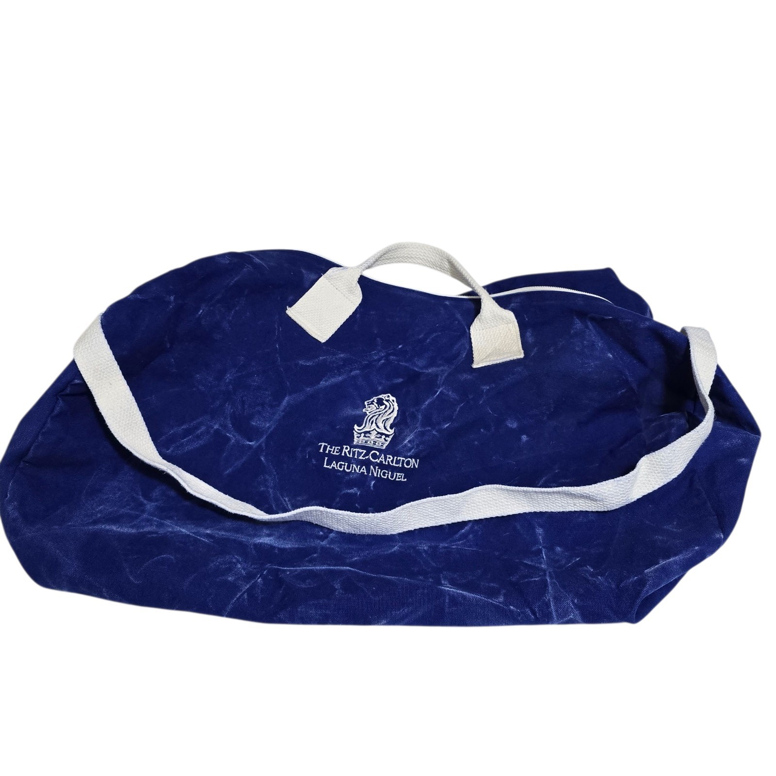 Excellent Condition Vintage Ritz Carlton Laguna Niguel Resort Duffel Bag Blue / White Canvas Large Embroidered Zip-Up Bag