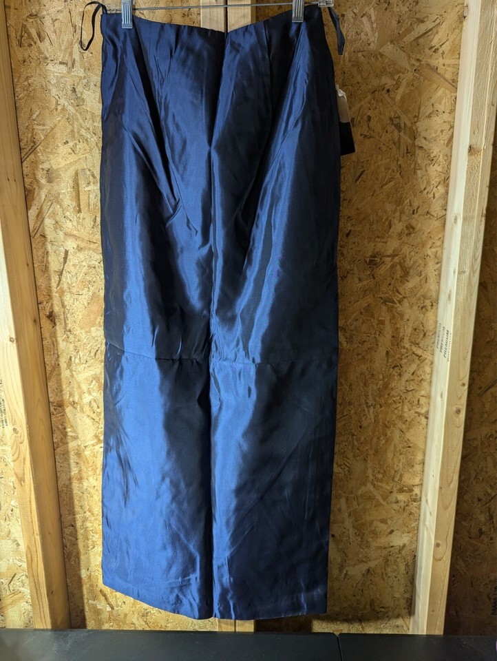 Add a touch of vintage glamour to your wardrobe with this stunning Scott McClintock evening maxi skirt. The shiny black satin fabric is accented with a bold logo and a zipper closure for a unique and stylish look. Perfect for a formal occasion or a party, this skirt is lined and has a high rise for added comfort. The long length and solid pattern make it a versatile piece that can be worn in any season. Dry clean only.
