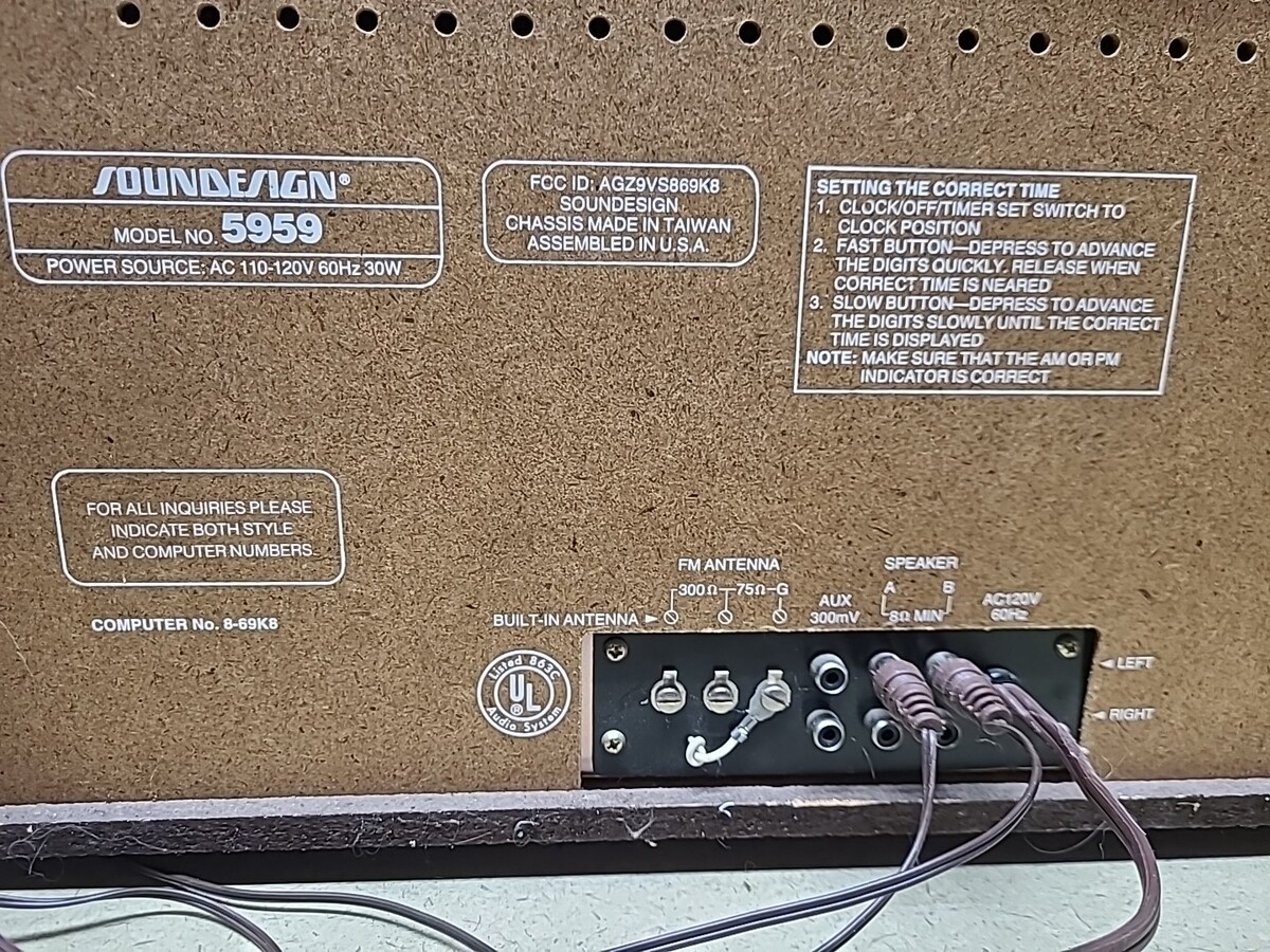 The VTG Sound Design 5959 AM FM Stereo Receiver Cassette Tape Deck 8 Track Speakers is a vintage audio system manufactured by Soundesign in Japan. This retro receiver combines AM and FM stereo capabilities with a cassette tape deck, making it a versatile piece for vintage audio enthusiasts. With its unique 8-track speaker design, this product offers a nostalgic listening experience for those looking to enjoy music from different eras through a classic audio setup.
