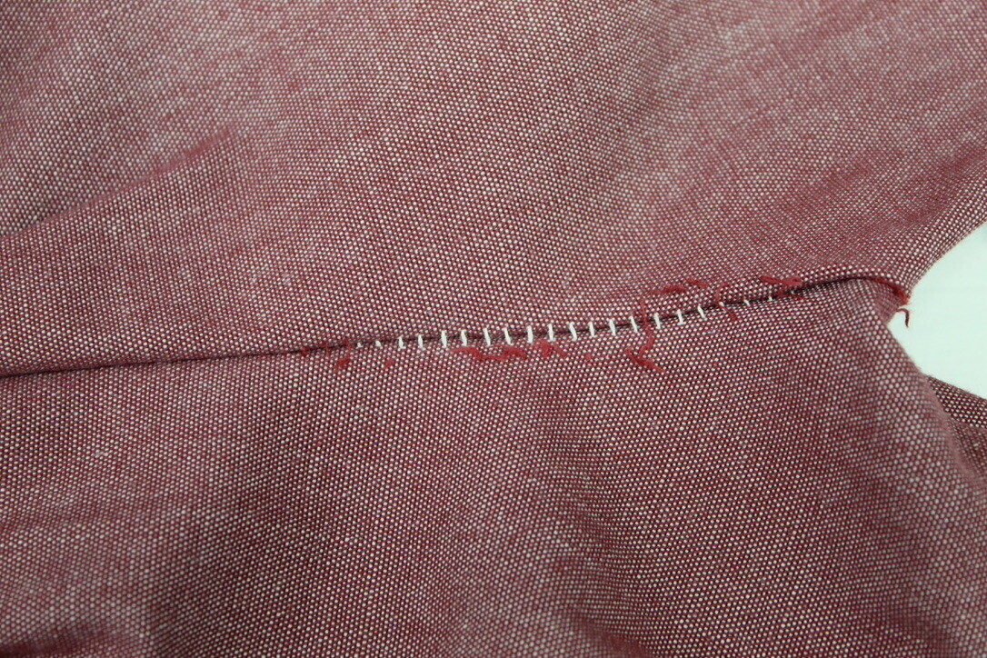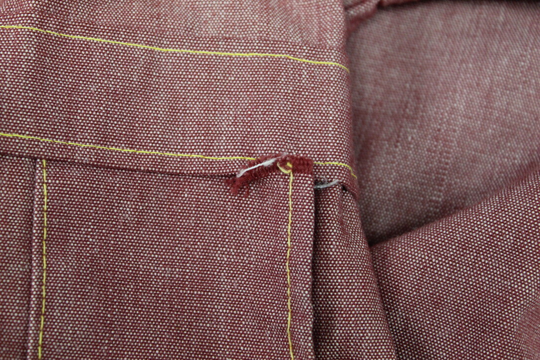 Raspberry denim cotton blend, yellow stitching, yellow embroidered elephant, snap closures, elastic at back waist, 1950s?70s