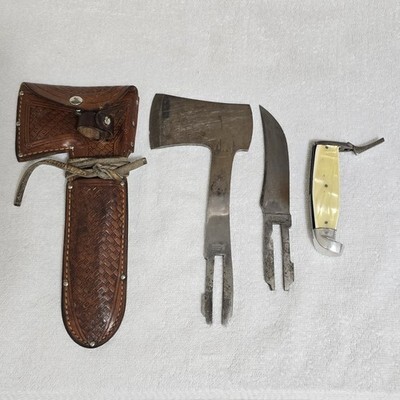 VTG Western Boulder Colo Knife Axe Combo Set with Leather Sheath USA 1930s