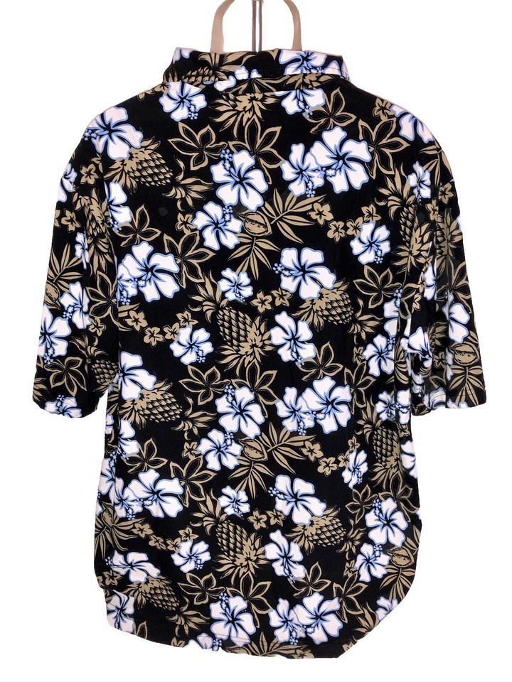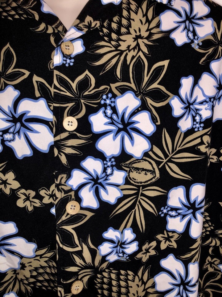 VTG Y2K ODO Hawaiian Shirt Men's XL Button Up Black White Blue Gold Floral Short Sleeve
