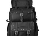 Large full size openings on each side allowing easy access to inside cargo even when the bag is still mounted on the motorcycle. Main side doors include 2 inside mesh pockets and one outside mesh pocket. Spacious interior with adjustable shelf. Fully adjustable mounting rig easily attaches to any sissy bar. Once adjusted it never needs adjustment again! Hard lined construction maintains the bags shape. Top roll bag for extra cargo capacity with shoulder strap and cargo straps that can mount the roll bag or strap down extra gear-; jacket, rain gear, sweatshirt etc. Top carrying handle, detachable back pack straps and shoulder strap for easy toting. Top pocket with mesh organizers. Lockable zippers throughout for added security. Constructed of a heavy, durable denier nylon heavy thread that is UV protected, water-weather resistant and made to last! Accented with leather look panels. (VS347 has chrome studs). Rain Cover with security tether included.