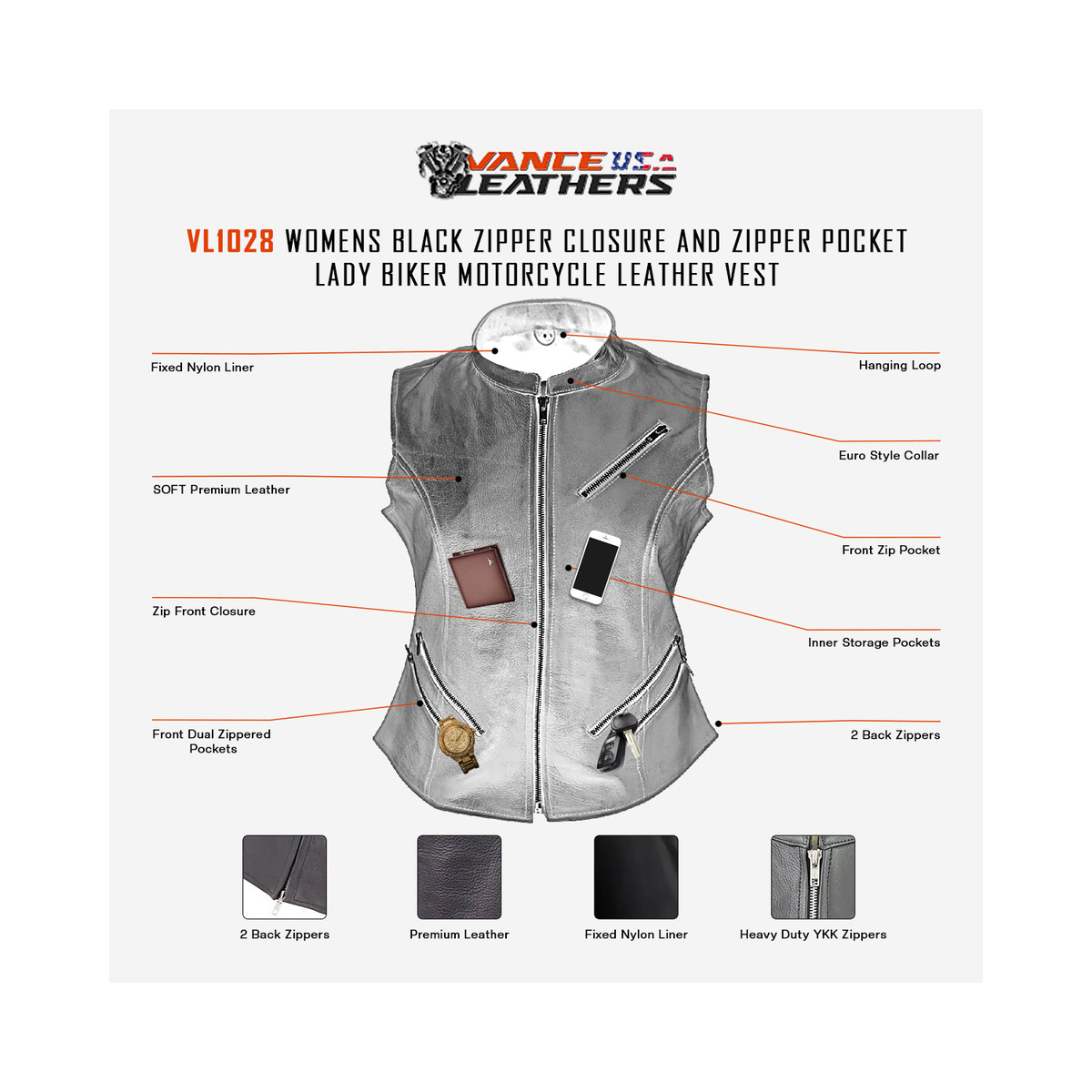 - Vance Leather Ladies Premium Leather Zipper Vest - 715404