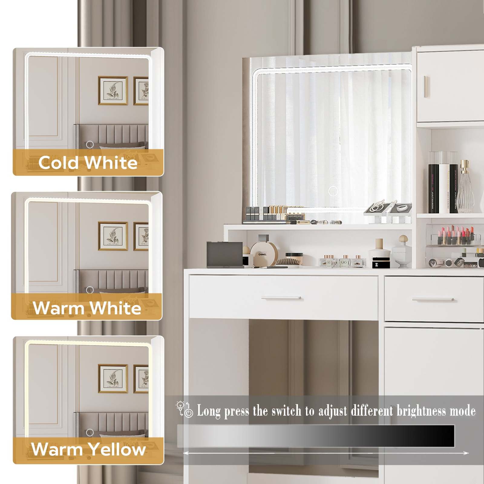 Versatile Mirror: The vanity table mirror comes with an adjustable LED light strip and a touch-controlled interface featuring three different lighting modes. This allows you to effortlessly achieve various makeup designs by selecting the desired lighting simulation. The long-press function also enables brightness adjustment, ensuring you achieve the ideal lighting effect in any environment.