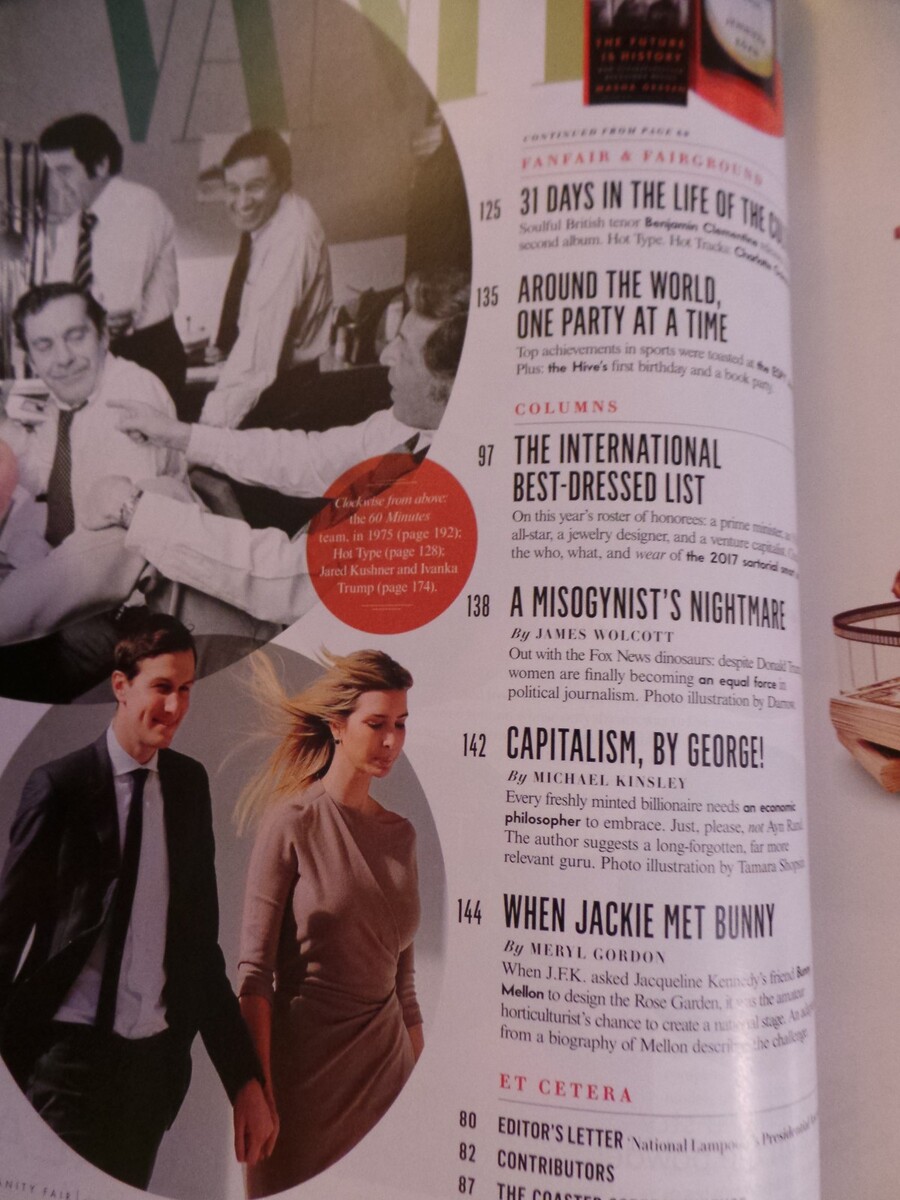 this is Vanity Fair Magazine from October 2017 featuring Meghan Markle Harry; Donald Trump; CBS 60 Minutes TV Show; Ivanka Jared; International Best Dressed List (Male Female) and alot more.