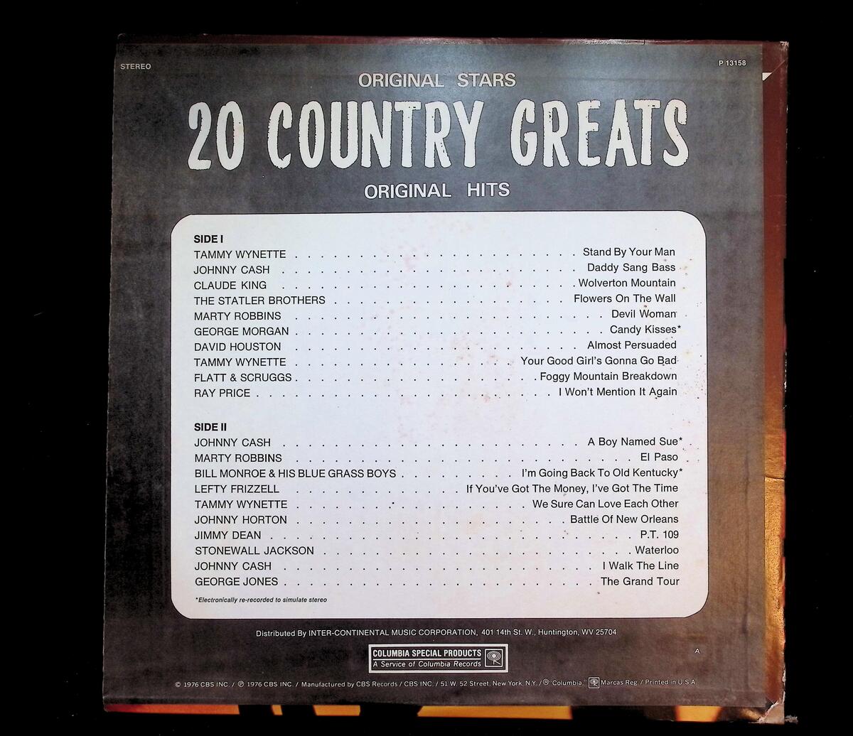 20 Country Greats LP by Various. Released in 1976 on Columbia Special Products. Catalog number P 13158. Pressed by Columbia Records Pressing Plant, Terre Haute.