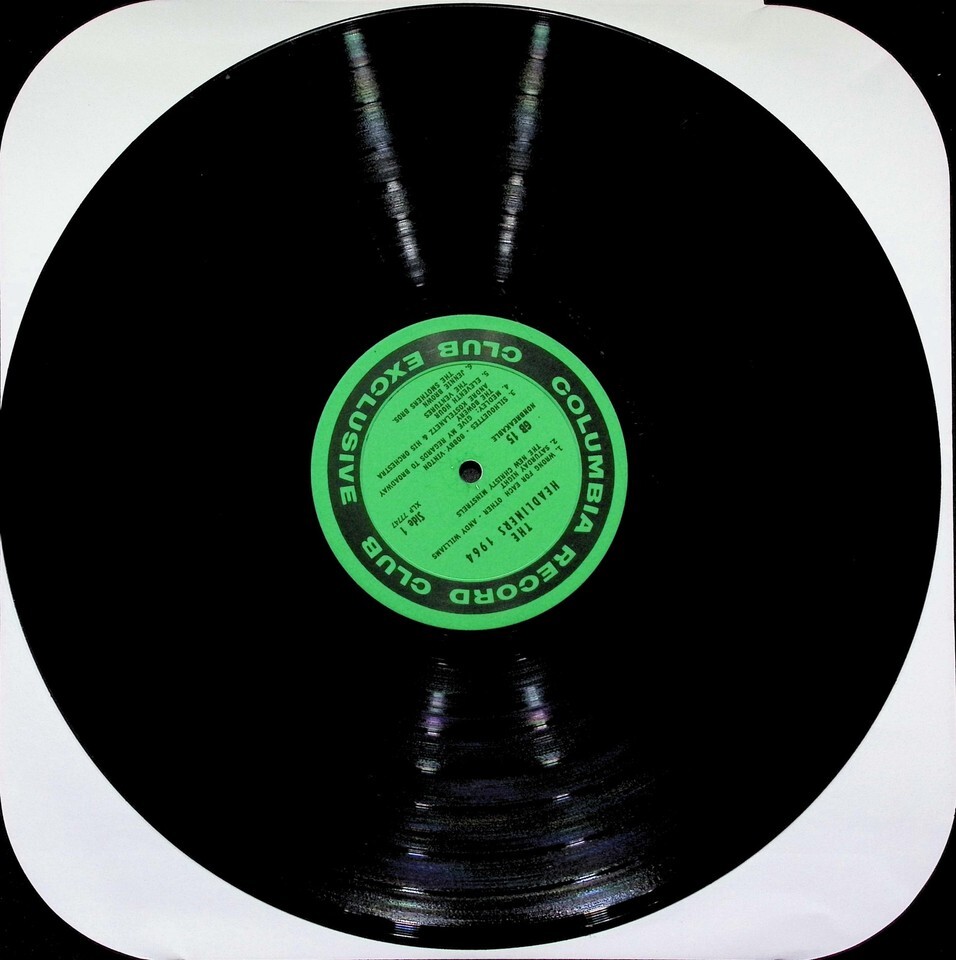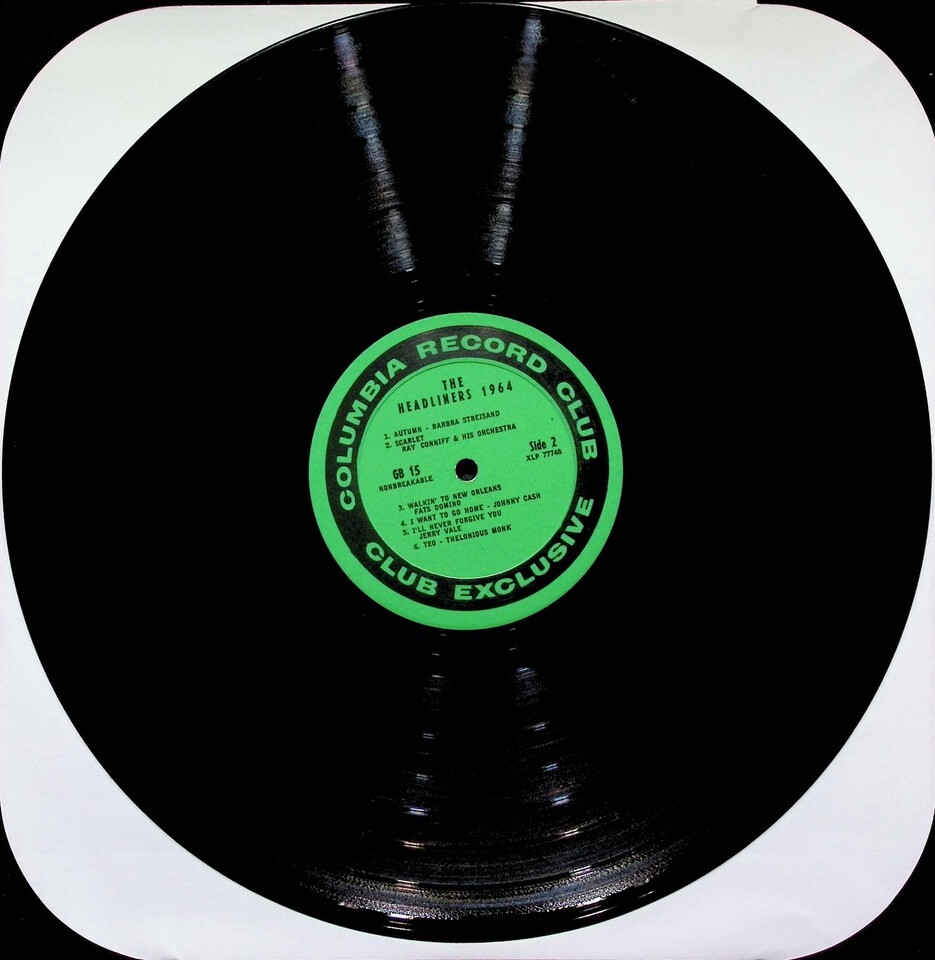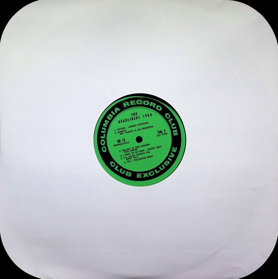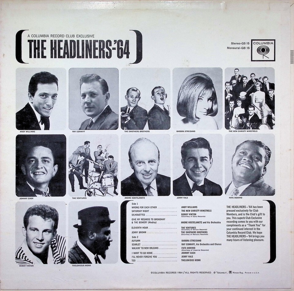 This is a Columbia Record Club exclusive LP, 'The Headliners-'64', issued as a 'Thank You' gift to club members in 1964. The catalog number GB 15 indicates the Monaural version. It features tracks courtesy of Epic Records, Dolton Records, Mercury Records, and Imperial Records. The record features green labels.