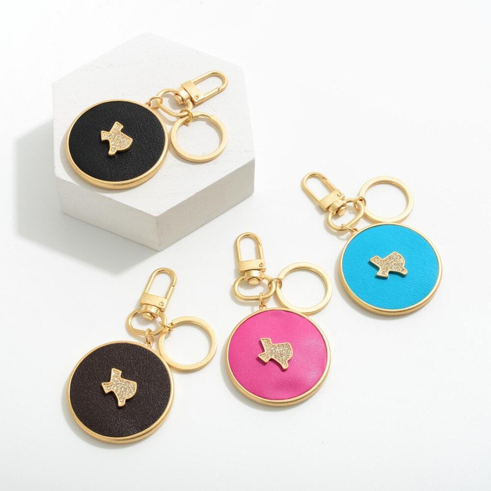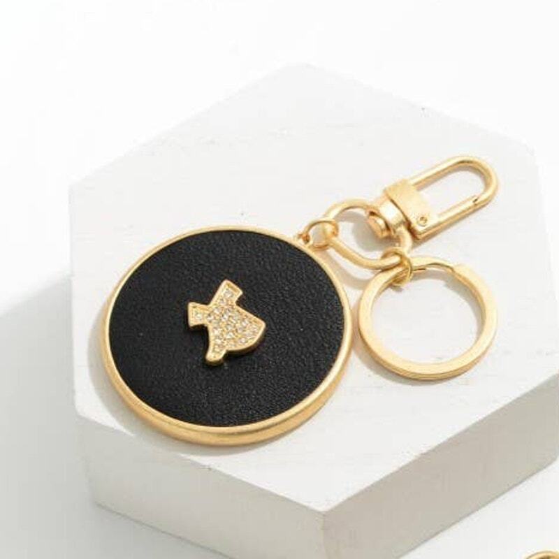 - Vegan Leather Crystal Black Gold Texas Keychain Keyring Bag Charm