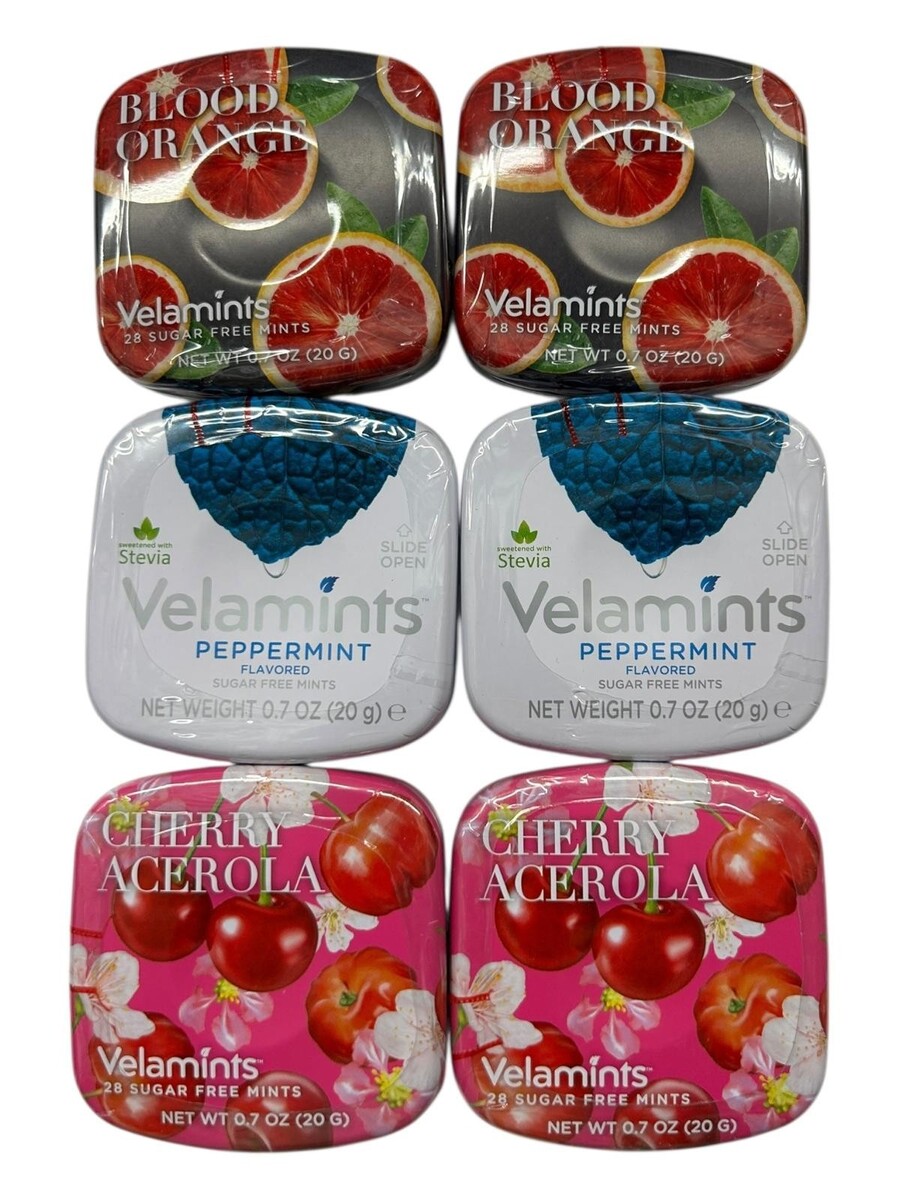 - Velamints Sugar Free Blood Orange, Peppermint, cherry Acerola Mints Pack 6