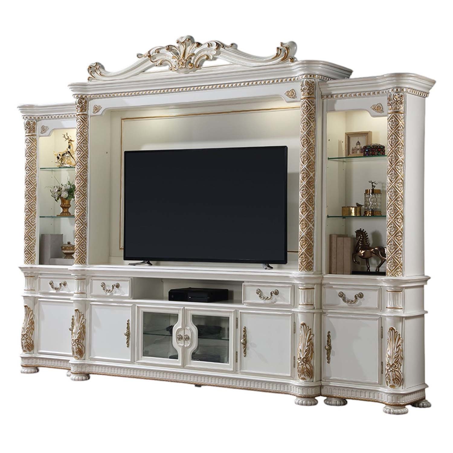 Introducing the stunning and functional Vendome TV stand that will elevate your home entertainment experience to the next level! This TV stand features three cabinets, one with glass doors that features a glass shelf, two storage drawers, and an open storage compartment, providing ample space to store your media devices and display your favorite decorative items. The TV stand also features storage and media cable management, keeping your wires organized and out of sight. Crafted with attention to detail, this entertainment center boasts a classic design with a touch of elegance. The antique pearl finish with gold accents exudes sophistication, while the crown molding adds a touch of luxury to the overall look. This piece is sure to complement any decor style, from traditional to contemporary. The entertainment center is sold separately.