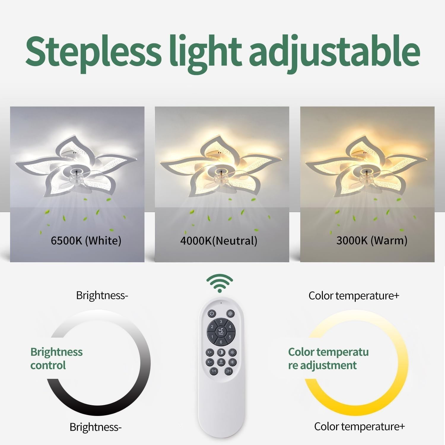 ?This flush mount ceiling fan with light has 6 different wind speeds dand a 1/2 hour timing setting, as well as stepless dimming function, all of which can be controlled by the remote control/APP.