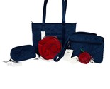 The blue quilted pieces feature a soft velvet-touch embossed rose design, paired with bold red rose accents. This retired,hard-to-find collection is no longer available in stores, making it a rare chance to own multiple coordinating pieces at once. Perfect for Disney and Vera Bradley collectors.