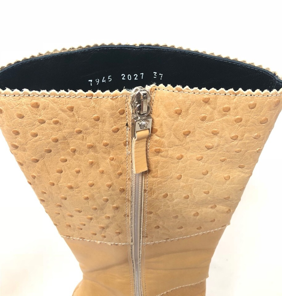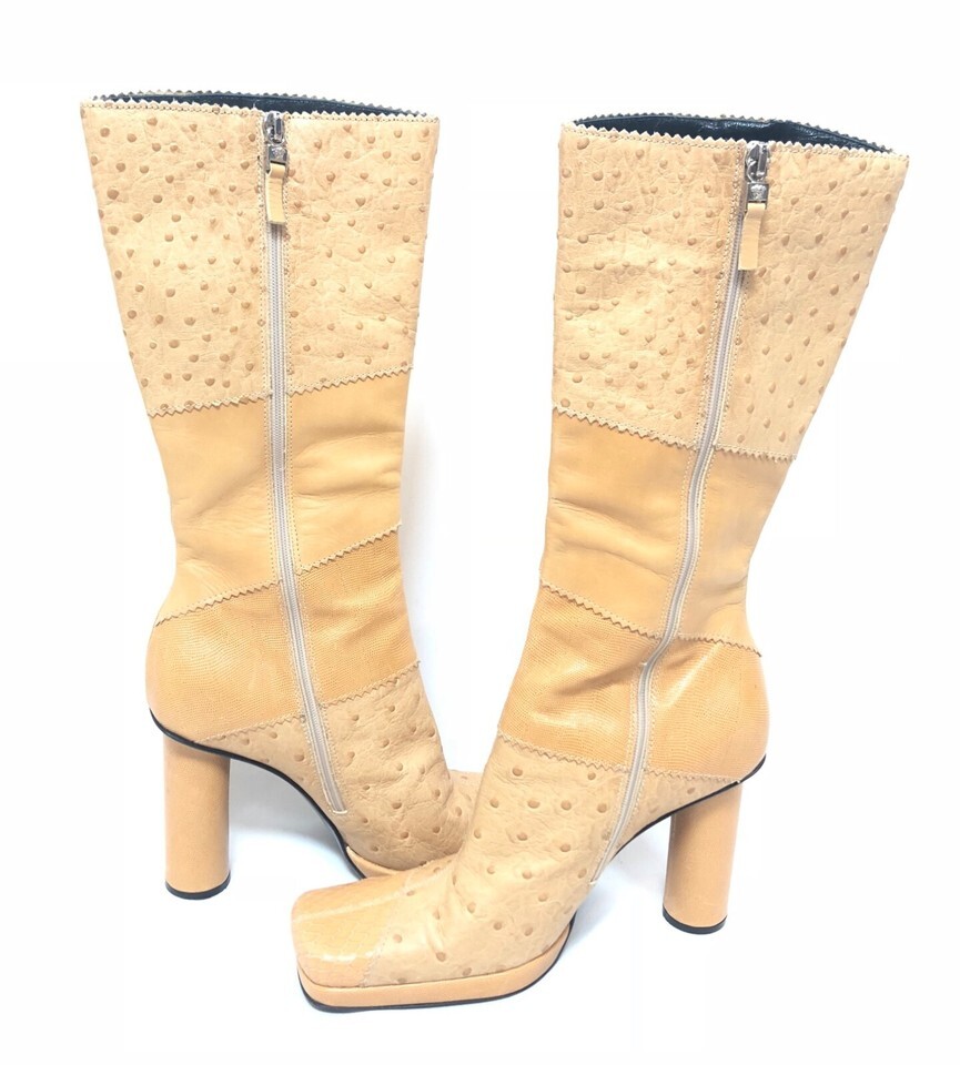 - Versace Vintage 1990’s Ostrich & Lizard Patchwork Tan Tall Leather Boots 37 7