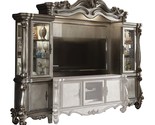 The Versailles the entertainment center was inspired by old European design. This collection features carved scrollwork accent on the bridge's crown. The collection pieces are carefully crafted with selected wood and veneers in antique platinum finish with hand brush accents. Offers regal features such as touched light, glass doors and shelves, and antique finish hardware. This entertainment center will give a royal sensation to your living room.