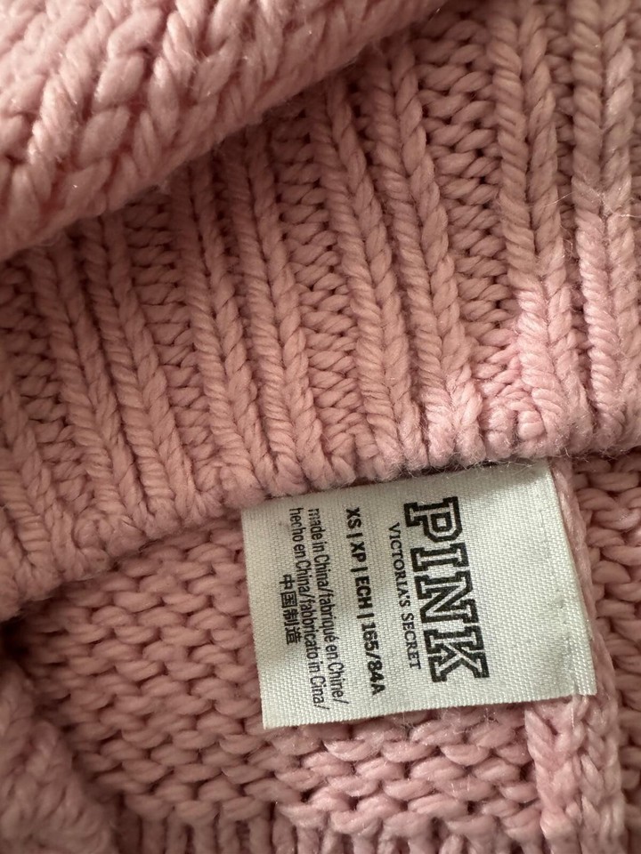 This Victoria's Secret PINK sweater is a chunky-knit pullover designed for women in size XS. It features a V-neckline, long sleeves, and is made from a blend of polyester and acrylic materials. The sweater comes in a solid pink color and has a regular fit, suitable for everyday wear. Made in China, this cozy knit sweater is a stylish addition to any wardrobe, perfect for staying warm and fashionable during the cooler seasons.