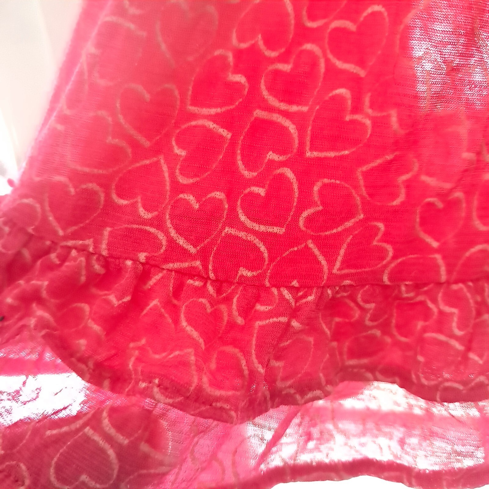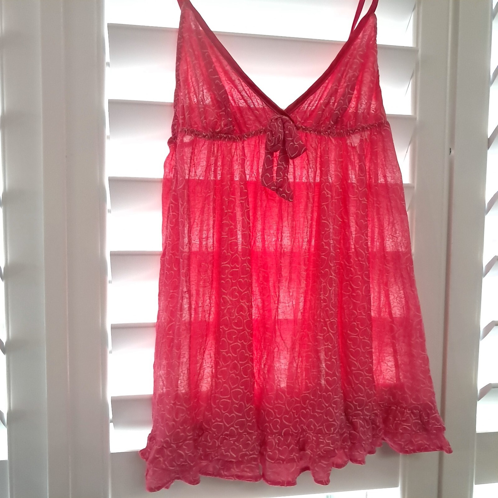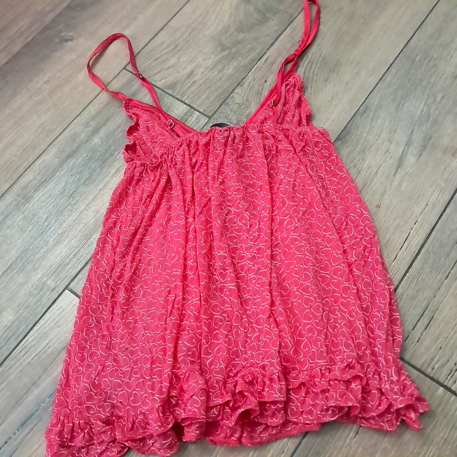 Sheer hot pink with hearts camisole/cami style baby doll top. Ruffles on the bottom. Adjustable straps.