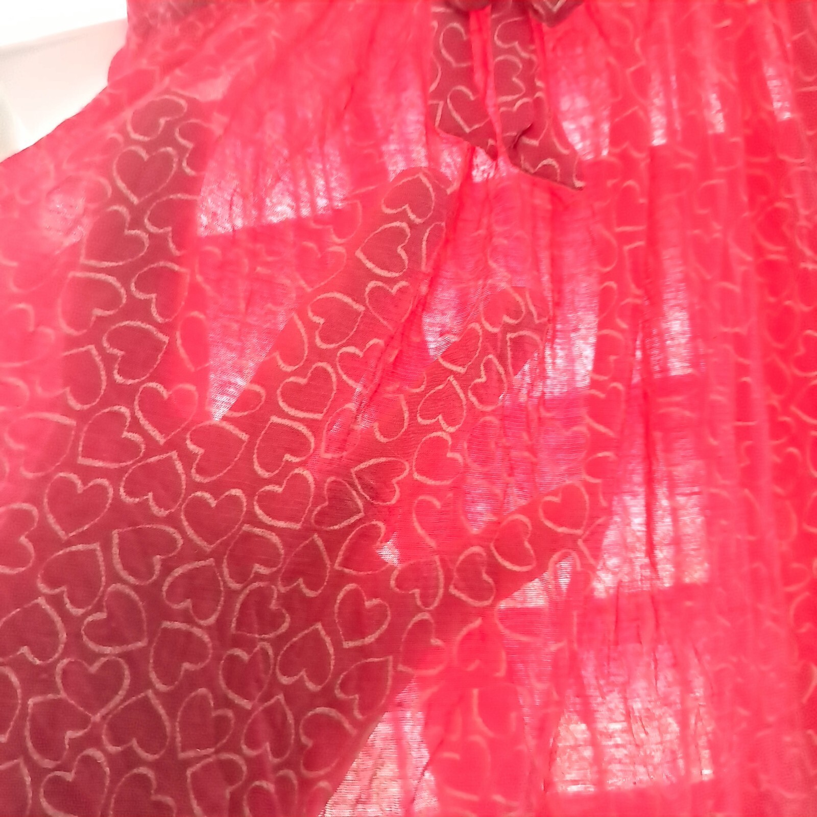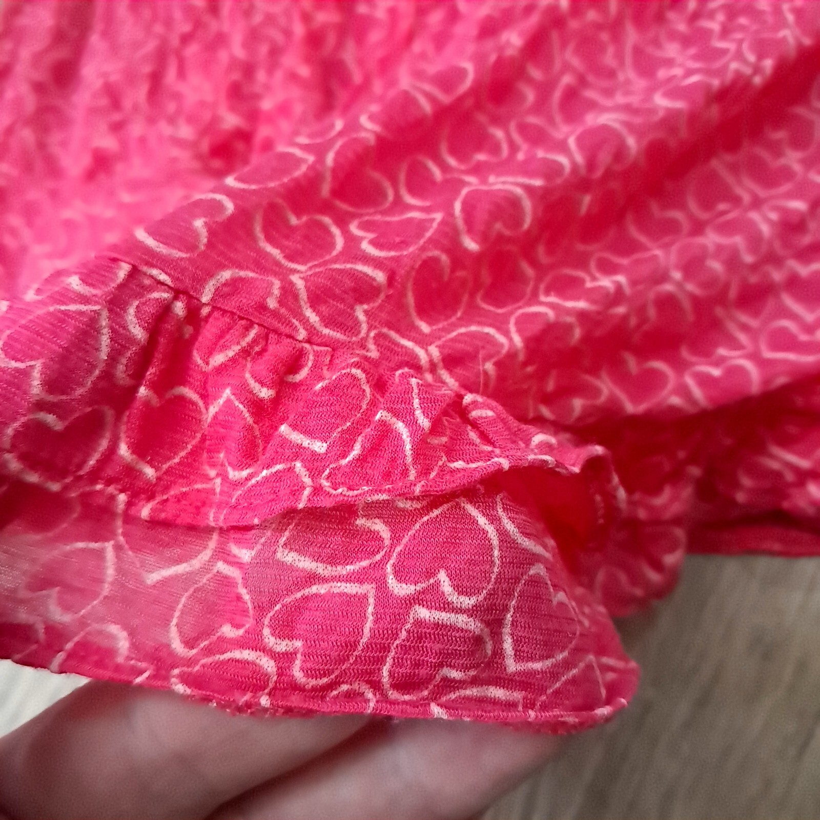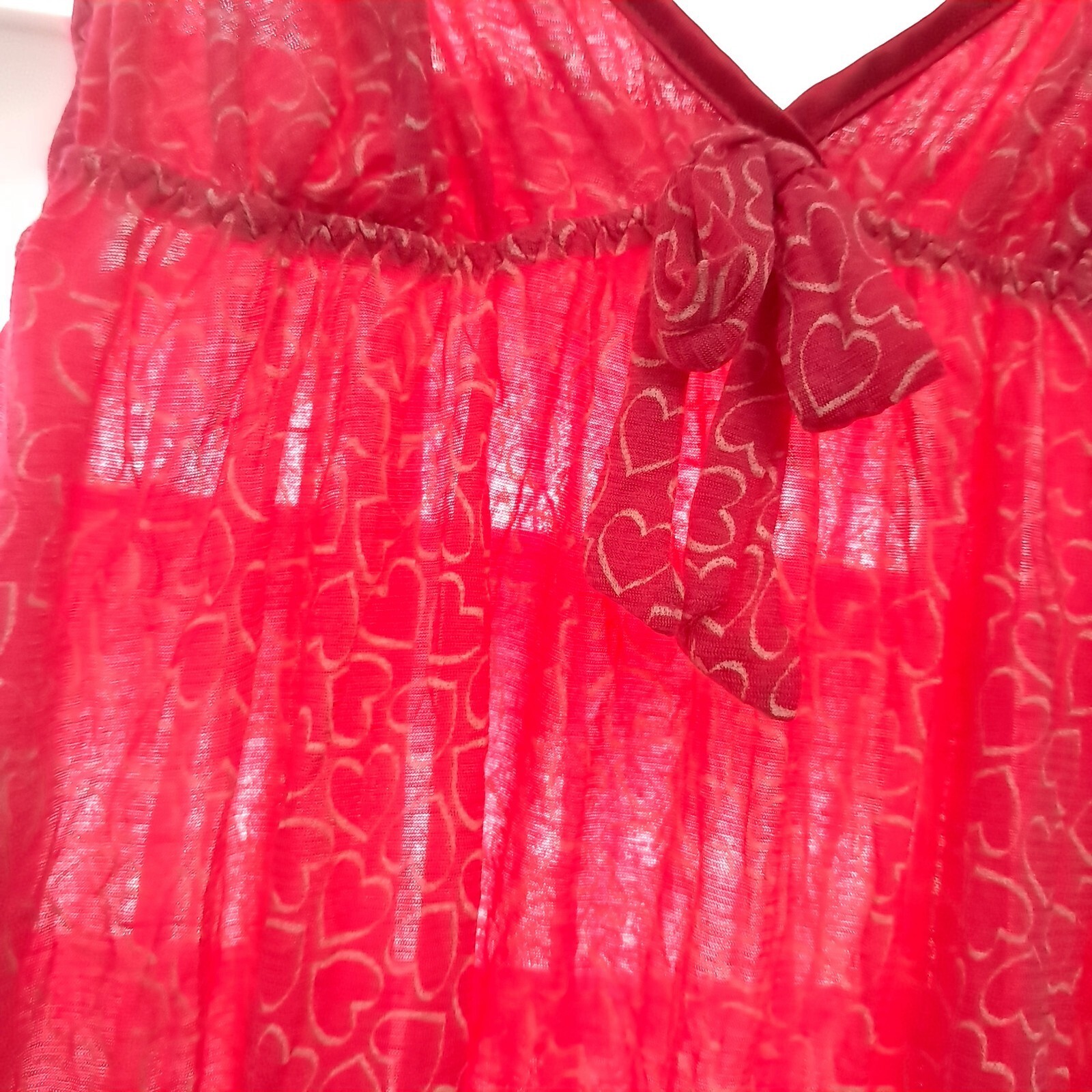 Sheer hot pink with hearts camisole/cami style baby doll top. Ruffles on the bottom. Adjustable straps.