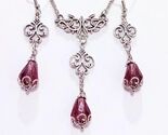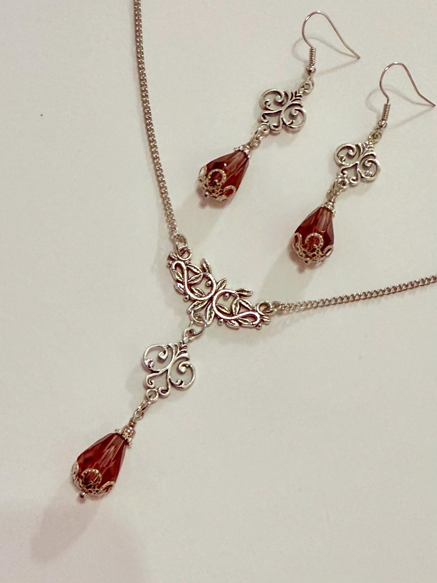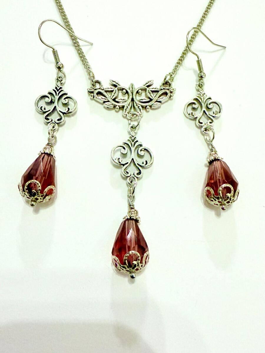 Silver-toned fine ornaments and Burgundy glass faceted teardrop shaped beads Victorian jewelry set necklace and earrings. Bohemian necklace and earrings .