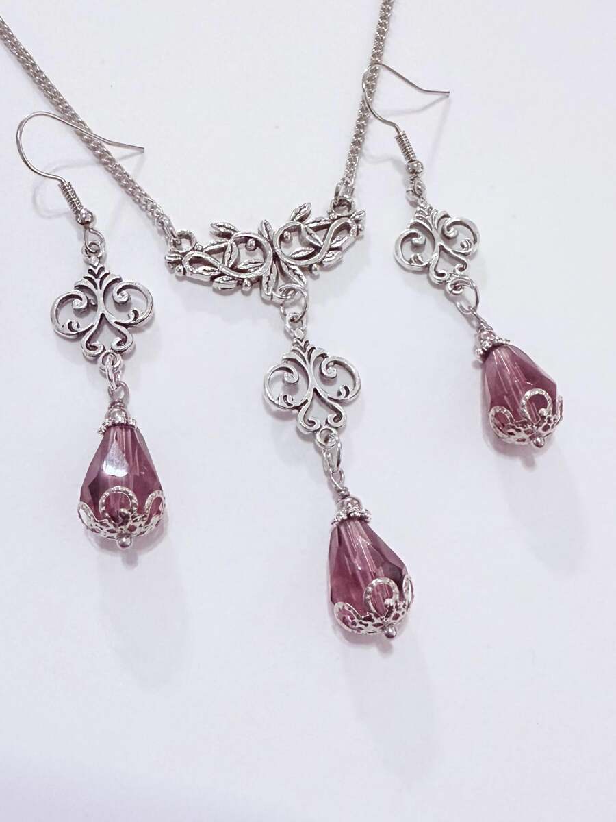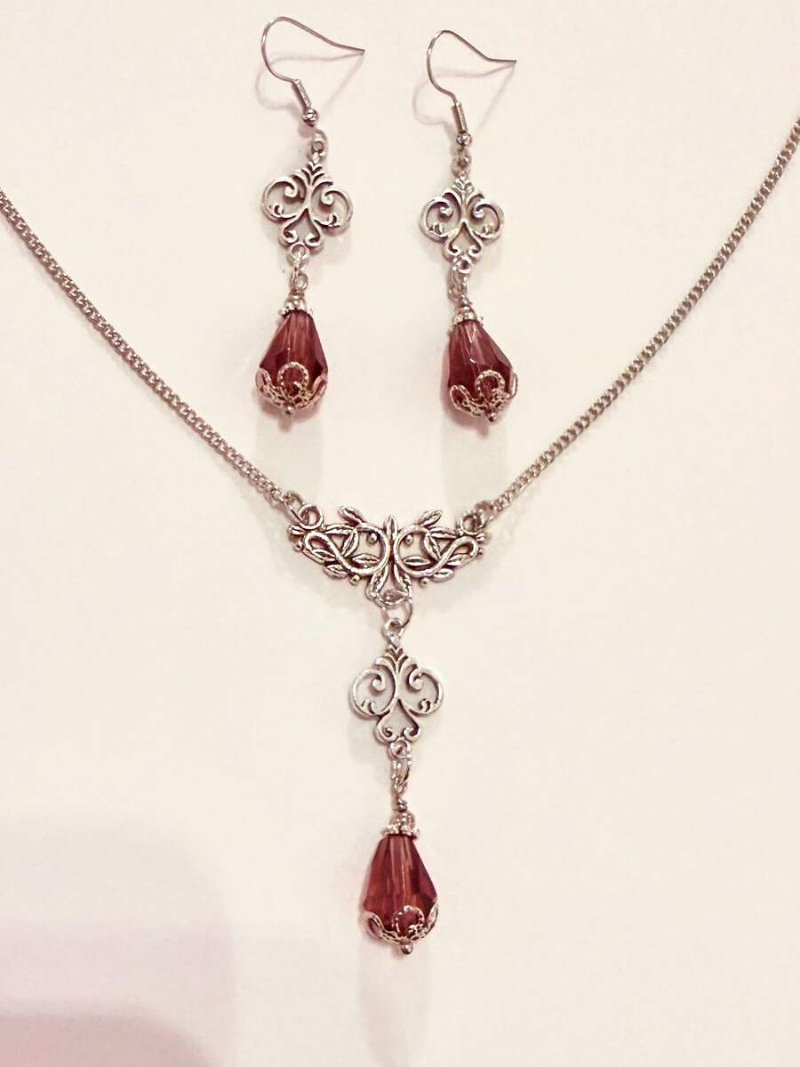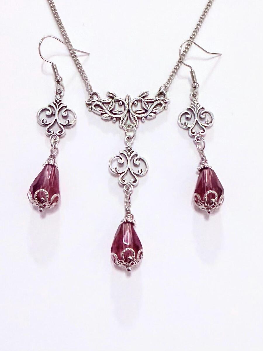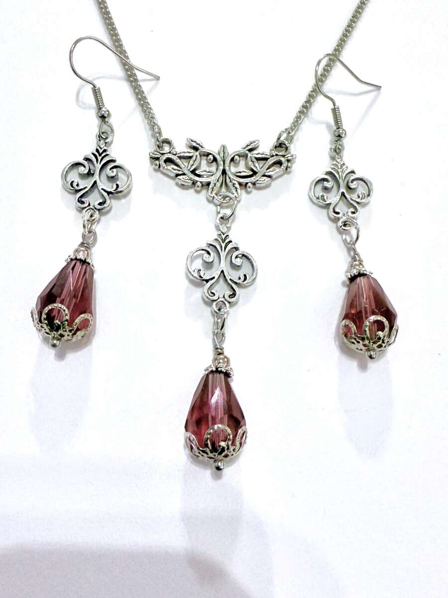 Beautiful Set of silver-tone Antique style Burgundy red-purple necklace and earrings. Silver tone pendant Victorian style necklace and earrings. Boho necklace. Bohemian necklace and earrings. Romantic necklace and earrings. Beautiful necklace with same style earrings with Burgundy glass handmade beads.
