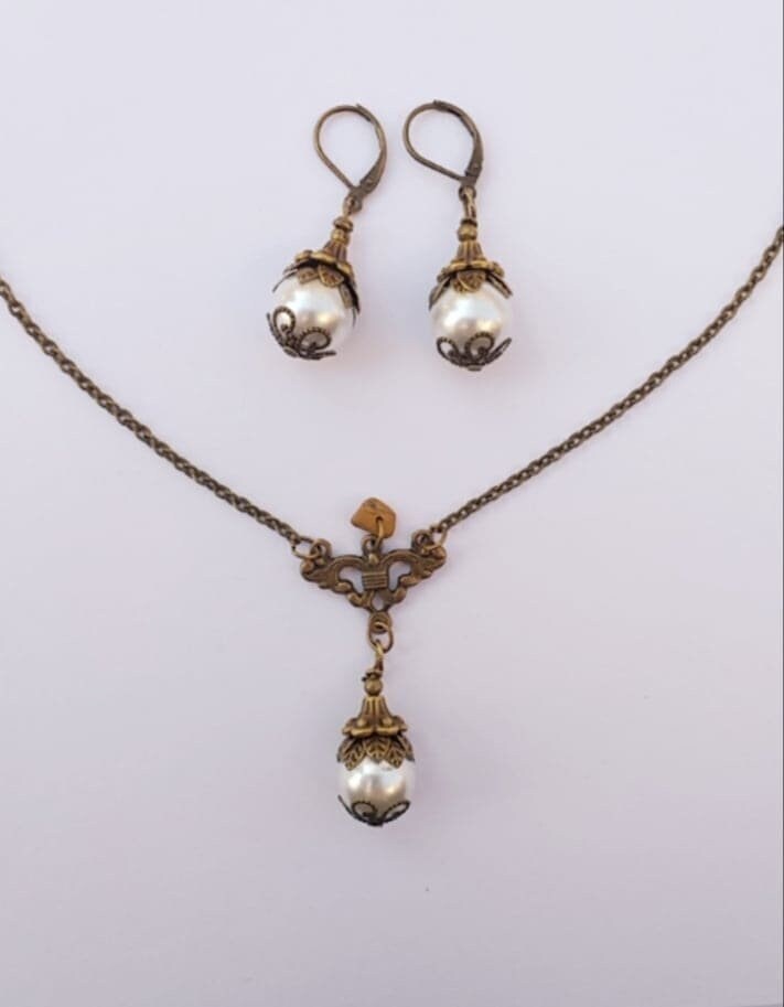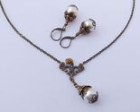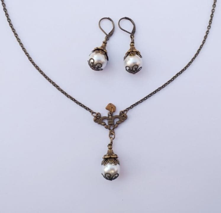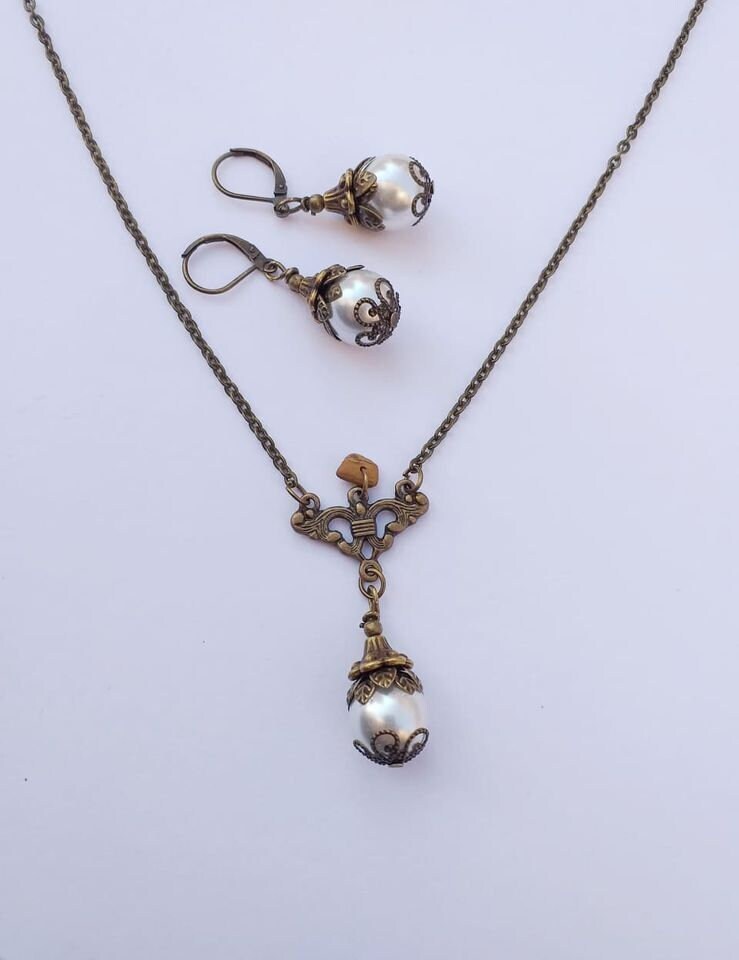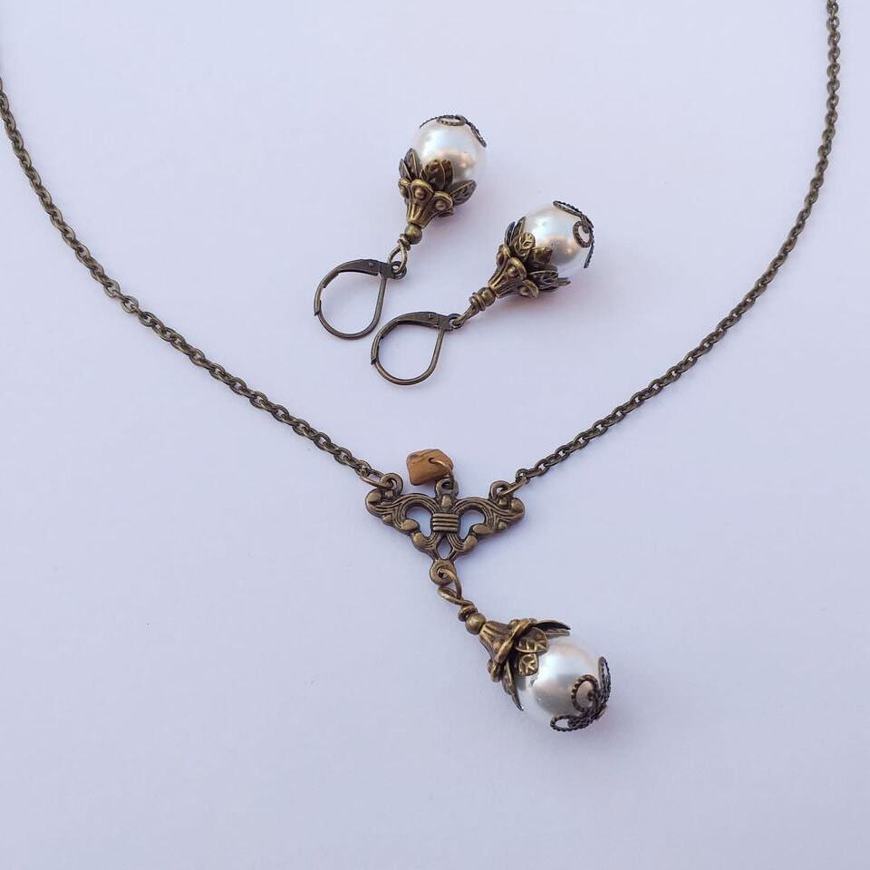 Victorian pearl bronze jewelry set bohemian jewelry set earrings necklace Boho set pearl set vintage set antique set bridal jewelry set