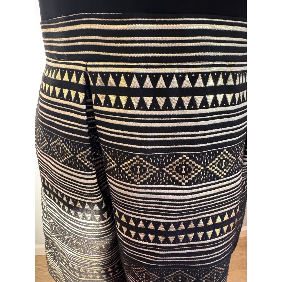 Color: Black bodice with metallic gold and ivory patterned skirt