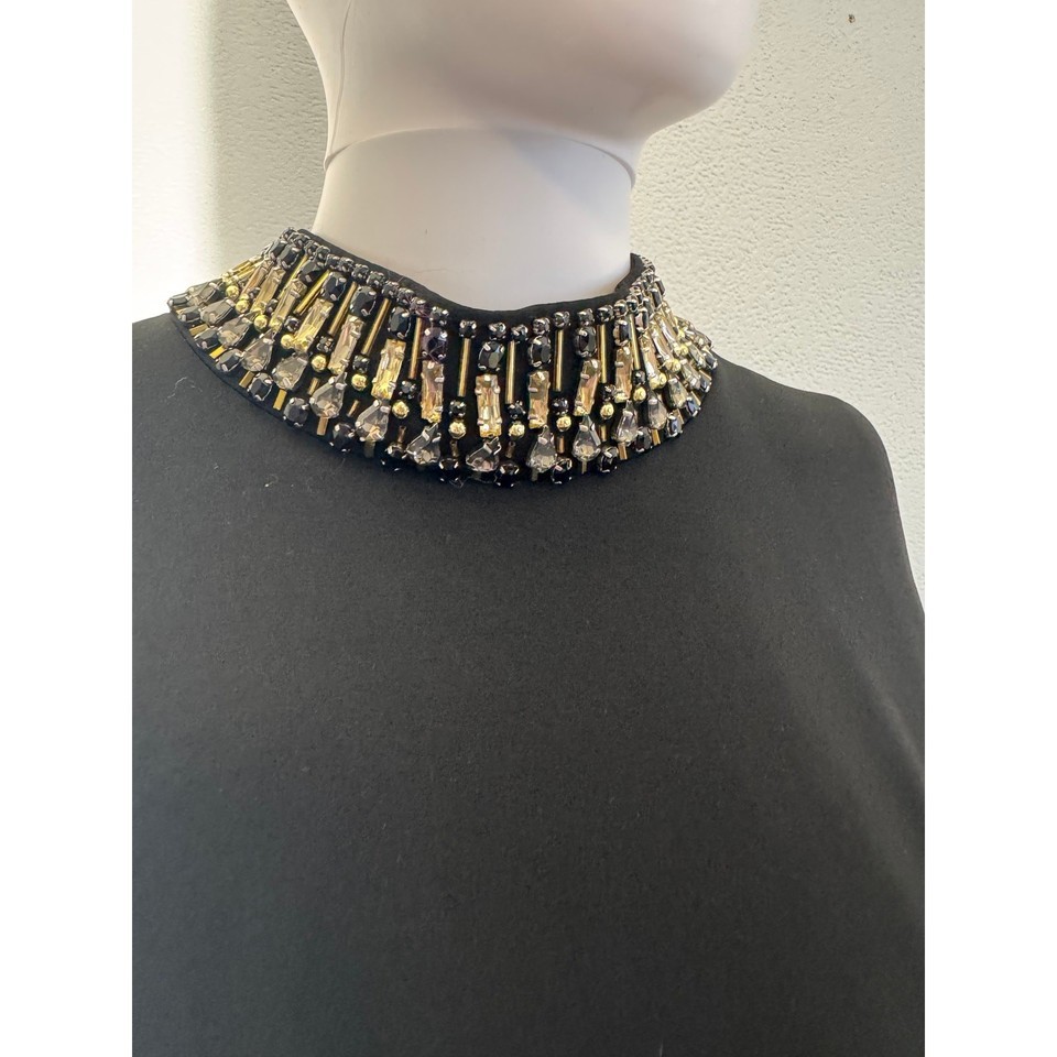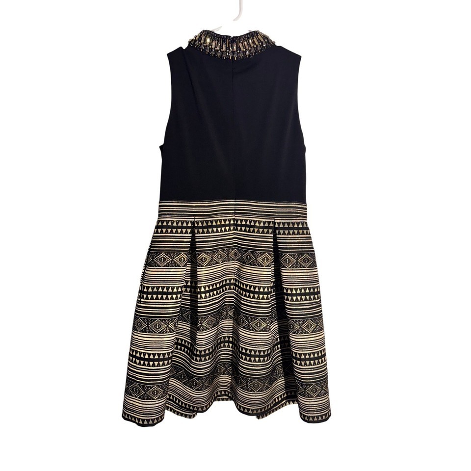 Elegant and bold, this Vince Camuto sleeveless fit flare dress features a dramatic beaded high neckline and a richly textured metallic tribal stripe skirt. A perfect statement piece for holiday parties, cocktail events, or evening occasions.