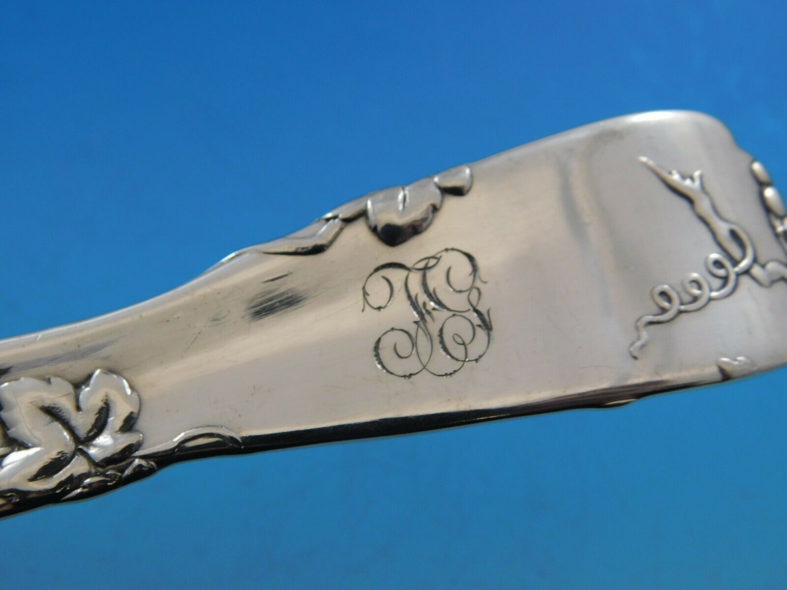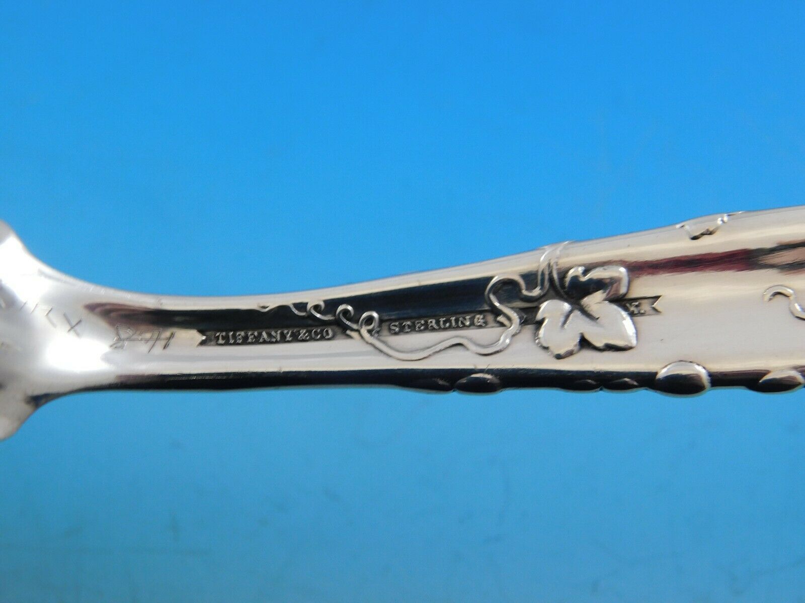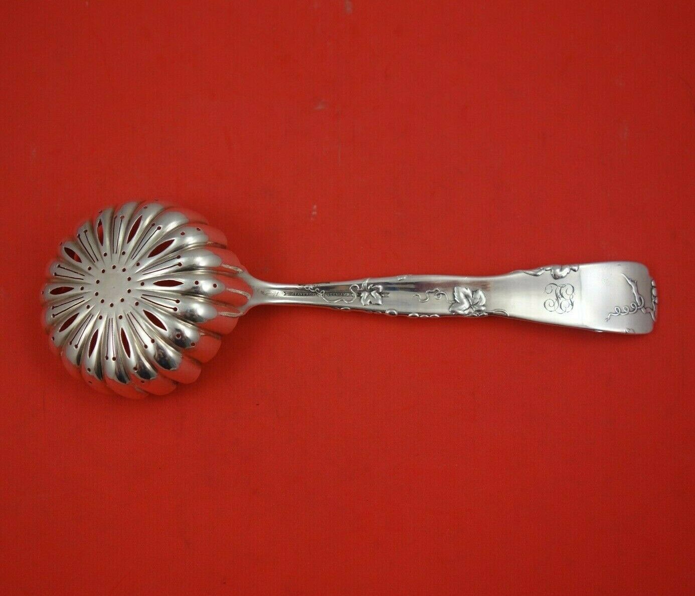 Sterling silver Pea Spoon with Grapes Motif 8 3/4" in the multi-motif pattern Vine by Tiffany and Co. It is monogrammed on the reverse (monos vary) and is in excellent condition.