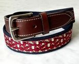 Vineyard Vines Canvas Club Pizza, Beer and Wings belt is in excellent condition. Maroon printed silk on cotton canvas webbing with brown Italian bridle leather and solid brass buckle. Embossed whale at the tip. Belt is 1-3/8 inches wide and 41 inches long. The size tag has been cut off.
