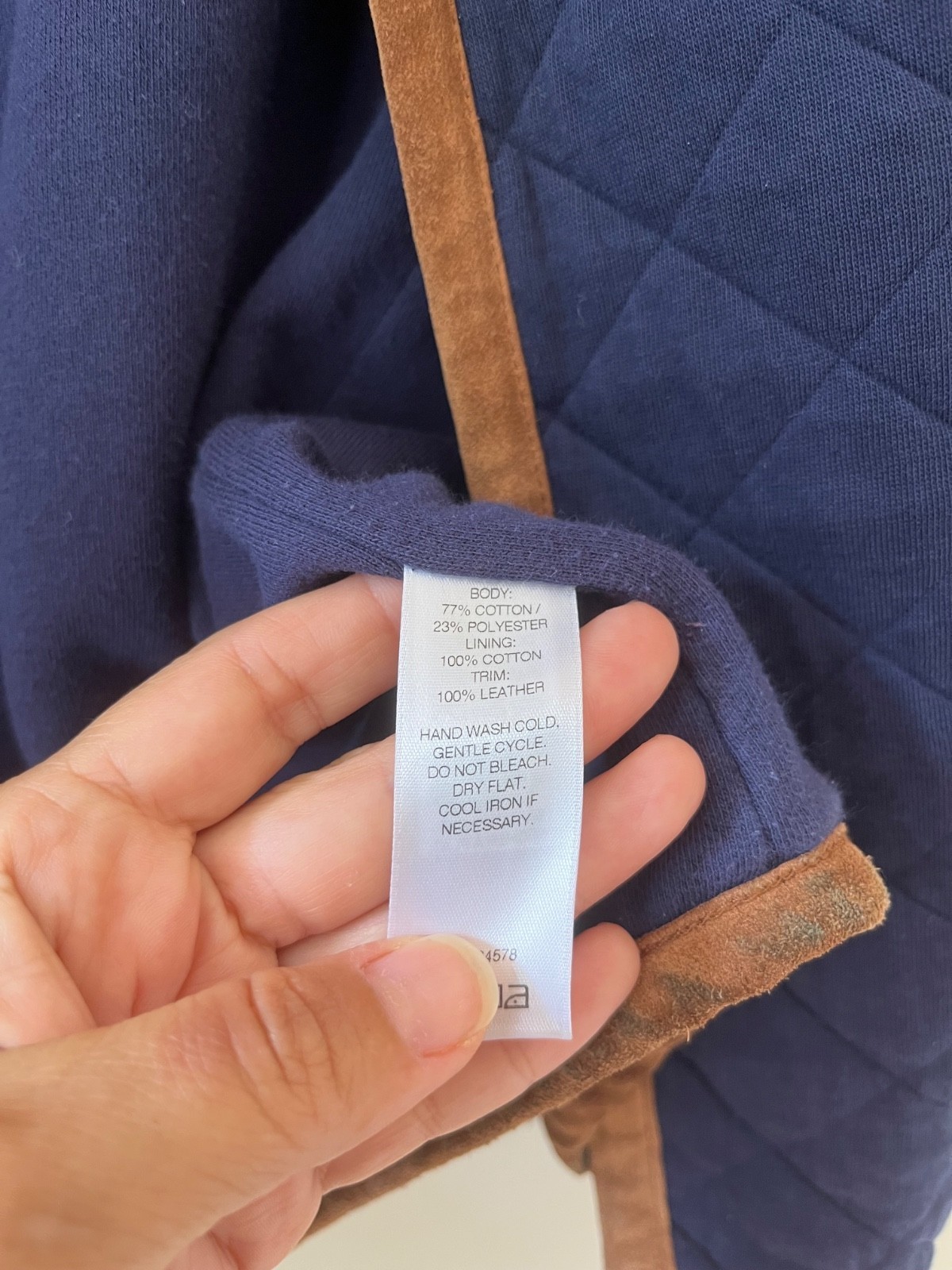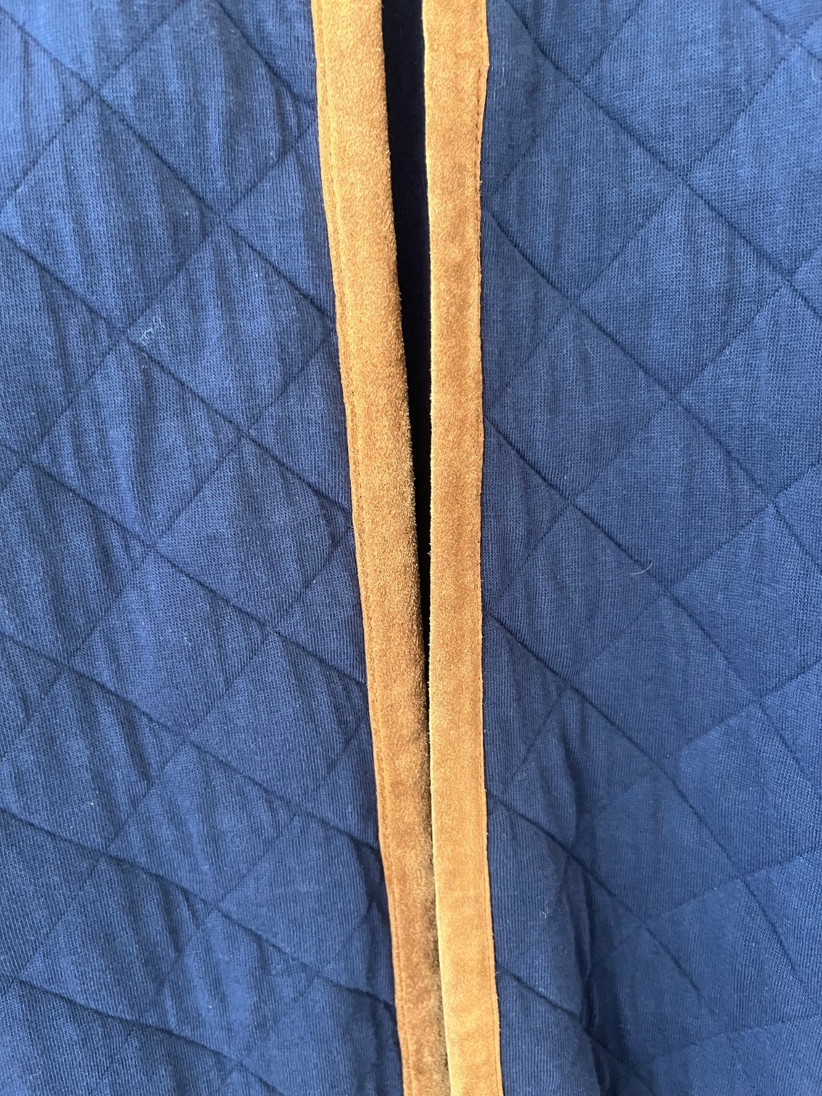 - Vineyard Vines Sz XL Blue Quilted Jacket Brown Leather Trimmed Pockets