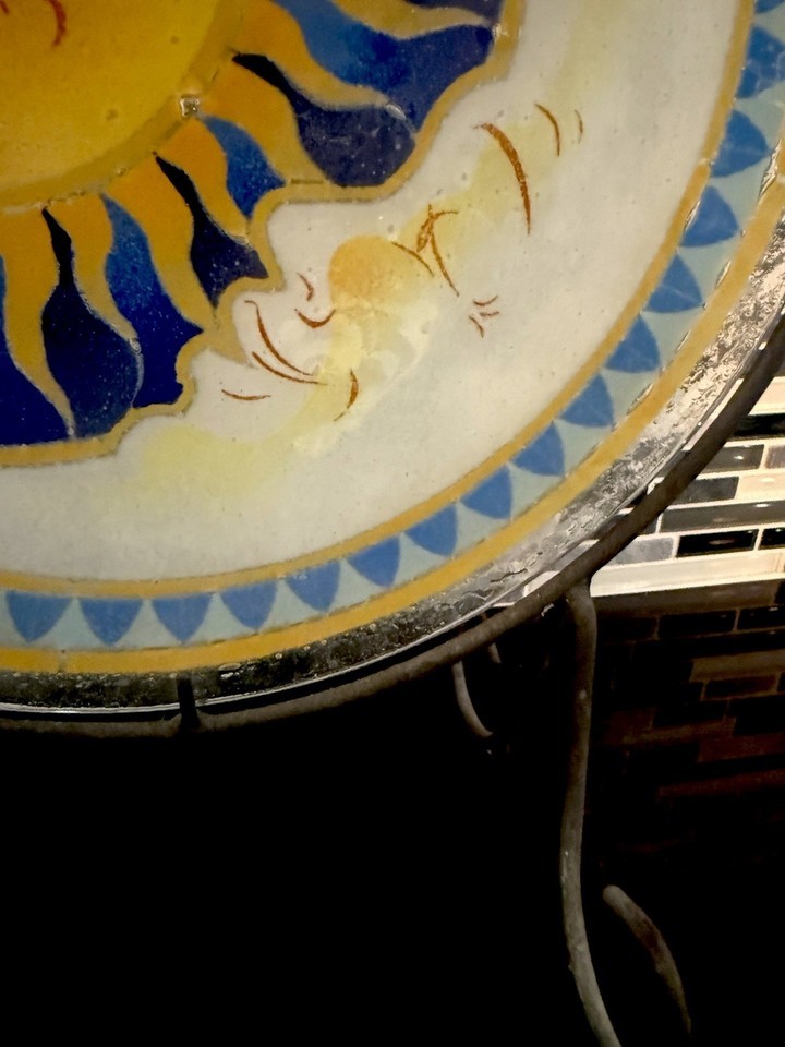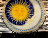 Bring celestial charm to your space with this striking 14-inch decorative glass plate featuring a radiant sun face paired with a serene crescent moon. Made of a fused glass design in vivid yellow, cobalt blue, and soft white, this piece captures the magic of night meeting day. Likely crafted in the late 20th century during the height of the celestial decor craze, it makes a perfect statement as wall art, a plate stand display, or a unique gift for lovers of boho and mystical style. Stand included