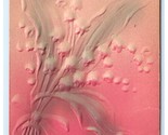 This exquisite vintage postcard features a beautifully embossed bouquet of Lily of the Valley flowers set against a rich pink background, showcasing a classic example of early 20th-century lithographic printing with chrome highlights. The delicate floral design is raised from the surface, creating a tactile and visually appealing effect that captures the elegance and sentimentality often found in postcards of this era.