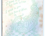 This charming vintage postcard from 1909 features an embossed paisley and floral design in soft green hues, complemented by an attached blue silk ribbon bow. The sentiment printed on the card reads, "To prove to you my love is true I send to you this Bow of Blue," evoking a heartfelt message of affection from the early 20th century. The card is a classic example of lithographed printed postcards popular in the Edwardian era, showcasing intricate line work and delicate ornamental patterns.