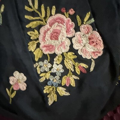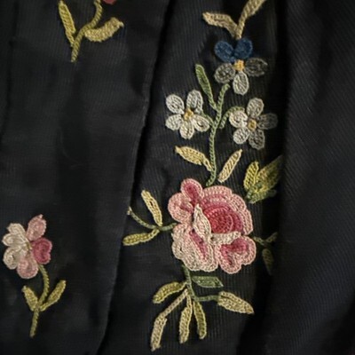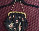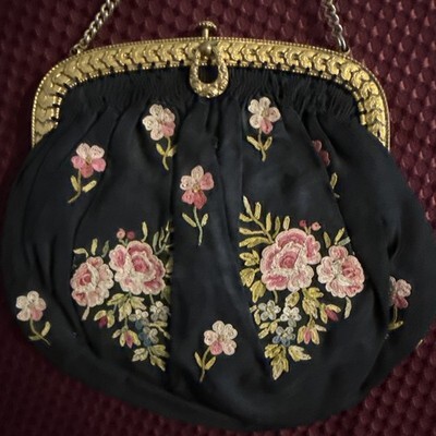 Exquisite 1930s silk evening purse in pristine vintage condition! Hand-embroidered petit point roses in pink, yellow gold on luxurious black ribbed silk faille. Solid brass frame with rare push-button ball clasp (press to open) and intricate floral engraving. Includes gold chain strap (tuck-in or wear). Mint ? no stains, tears, or wear; clasp works perfectly. Ideal 1940s handbag, vintage wedding clutch, Art Deco purse, or collector display. Antique embroidered evening bag, 1930s formal purse, petit point silk reticule ? true Golden Age glamour! Fast insured shipping.
