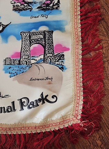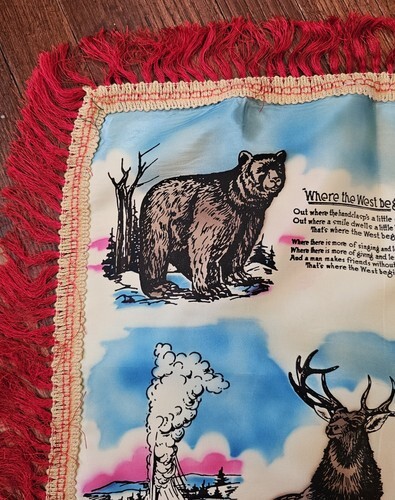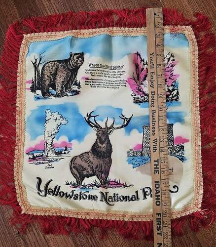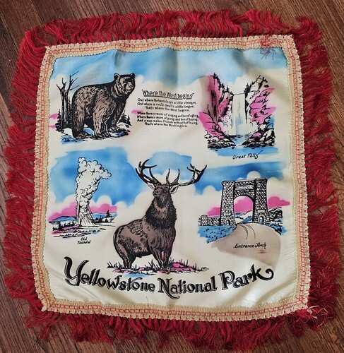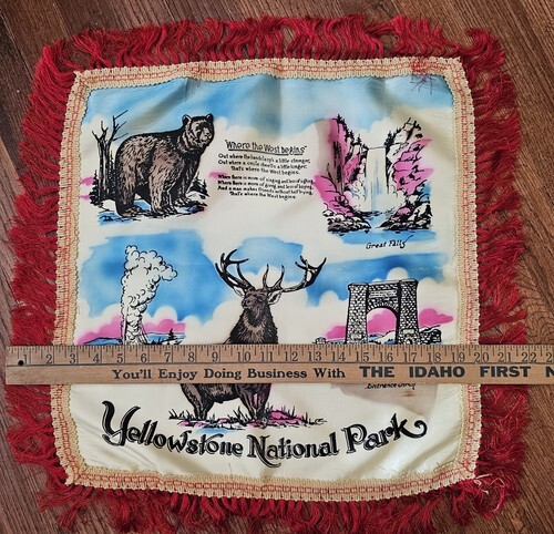 - Vintage 1940s-50s Yellowstone National Park Fringed Silk Souvenir Pillow Cover