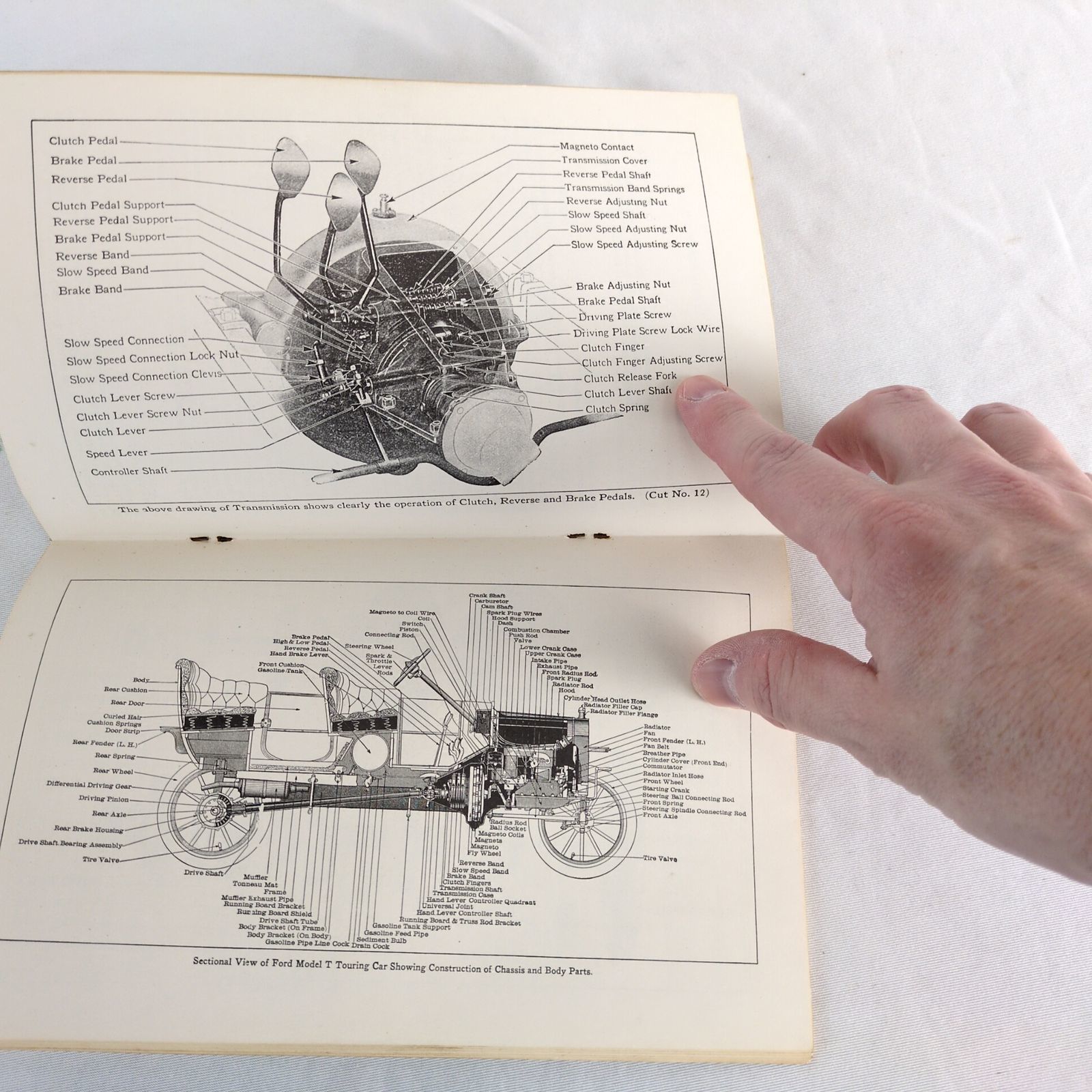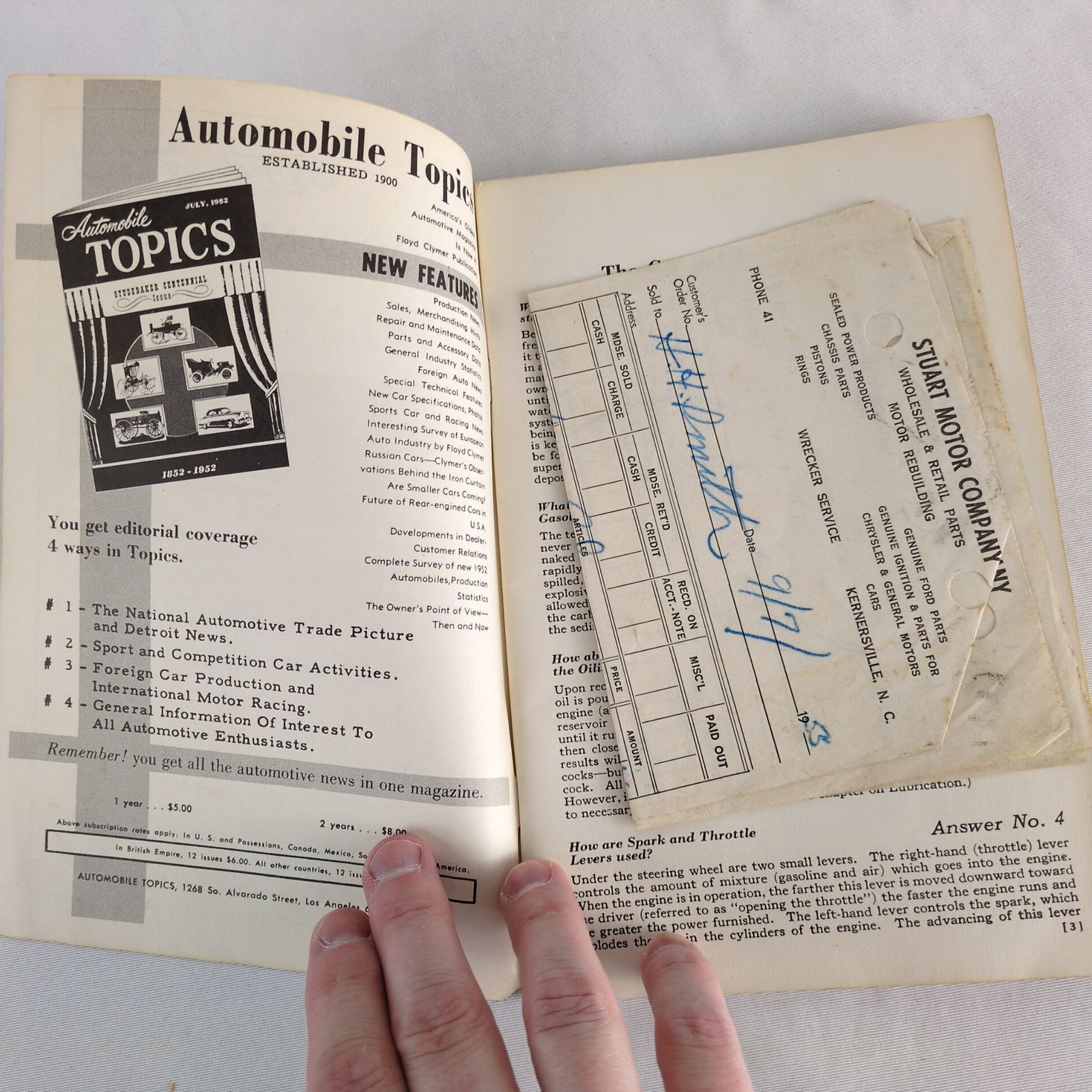 The booklet measures 8.5x5.5 inches and is in good condition for its age. It has a stapled binding that is still in-tact. The cover does have a stamp with someone's name. Inside the book are also receipts for car parts dated 1953 for a 1914 Ford Model T. A great addition to any collection or for the Model-T enthusiast.