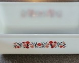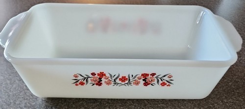 - Vintage 1960s Fire King Primrose Pink & Red Flower ~ 1 Qt Casserole Loaf Pan (1)